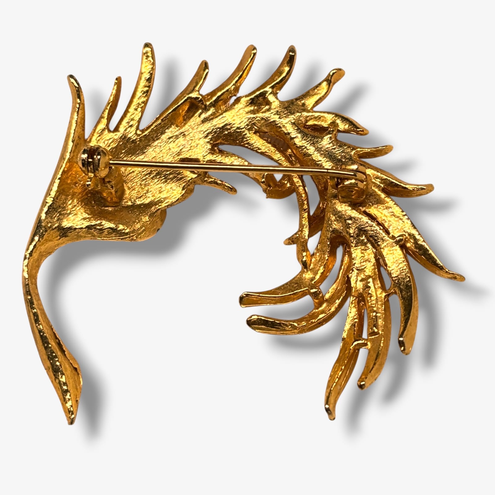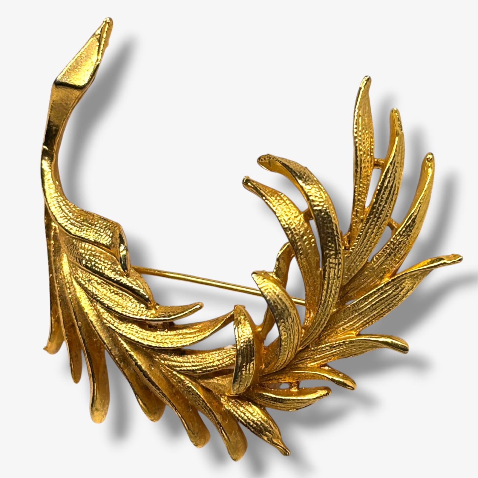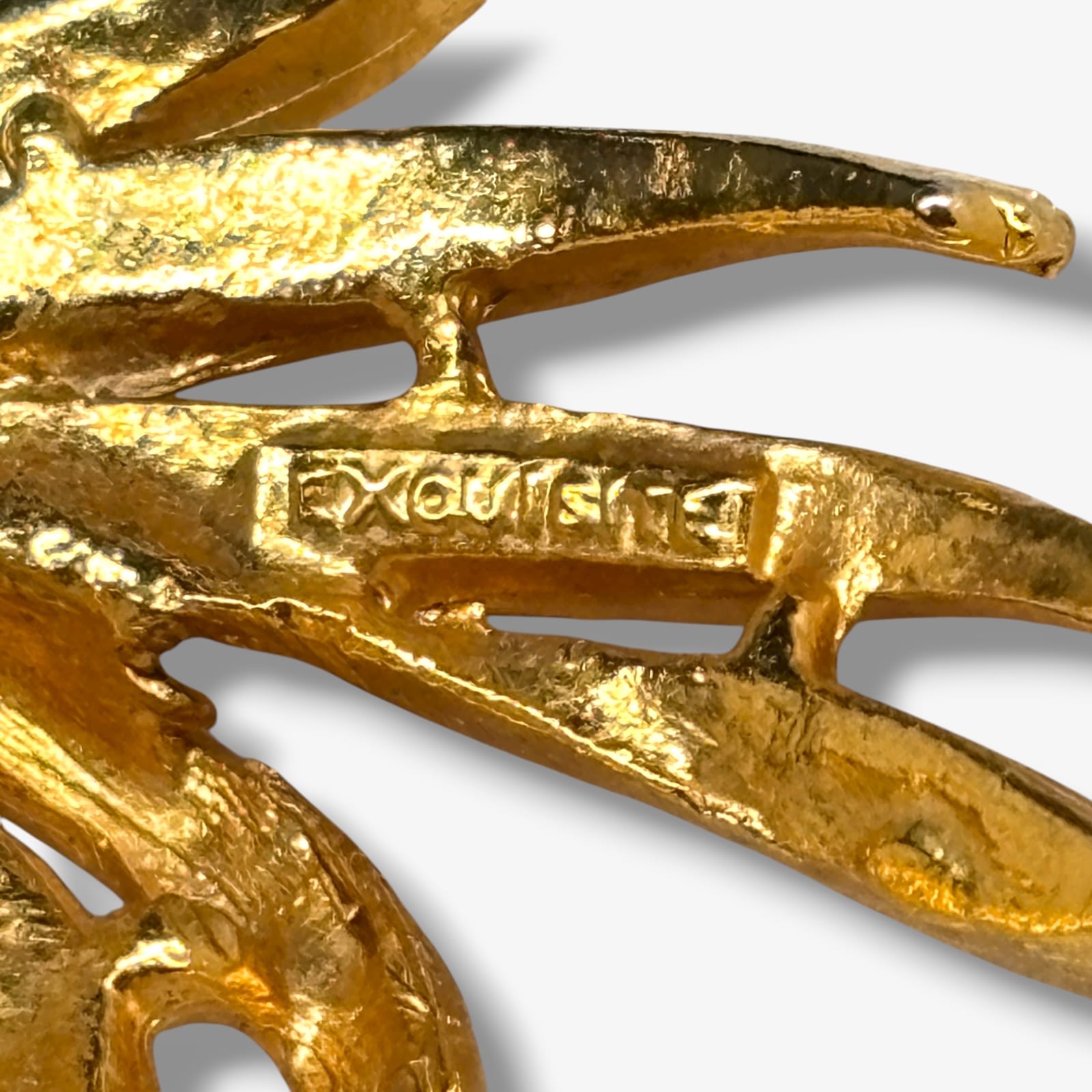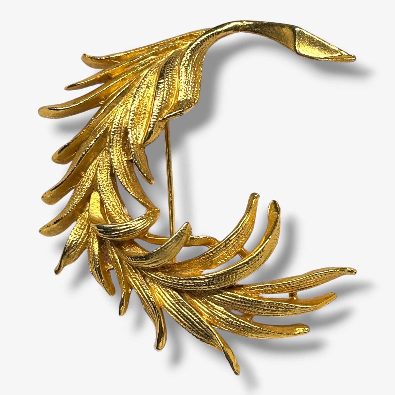 This vintage Exquisite brooch dates to the 1950s and showcases a dimensional leaf design crafted in bright gold tone metal with fine texturing and high-polished edges. The sculpted curves and layered fronds exemplify mid-century British costume jewelry artistry by WAP Watson Ltd under the Exquisite name. Measuring approximately 2 inches by 2 inches, it retains its original secure clasp and strong color throughout.