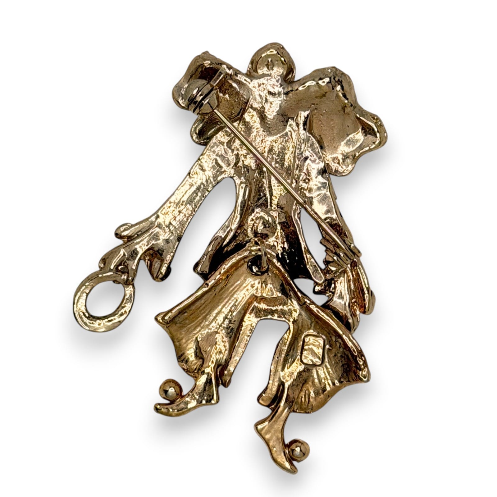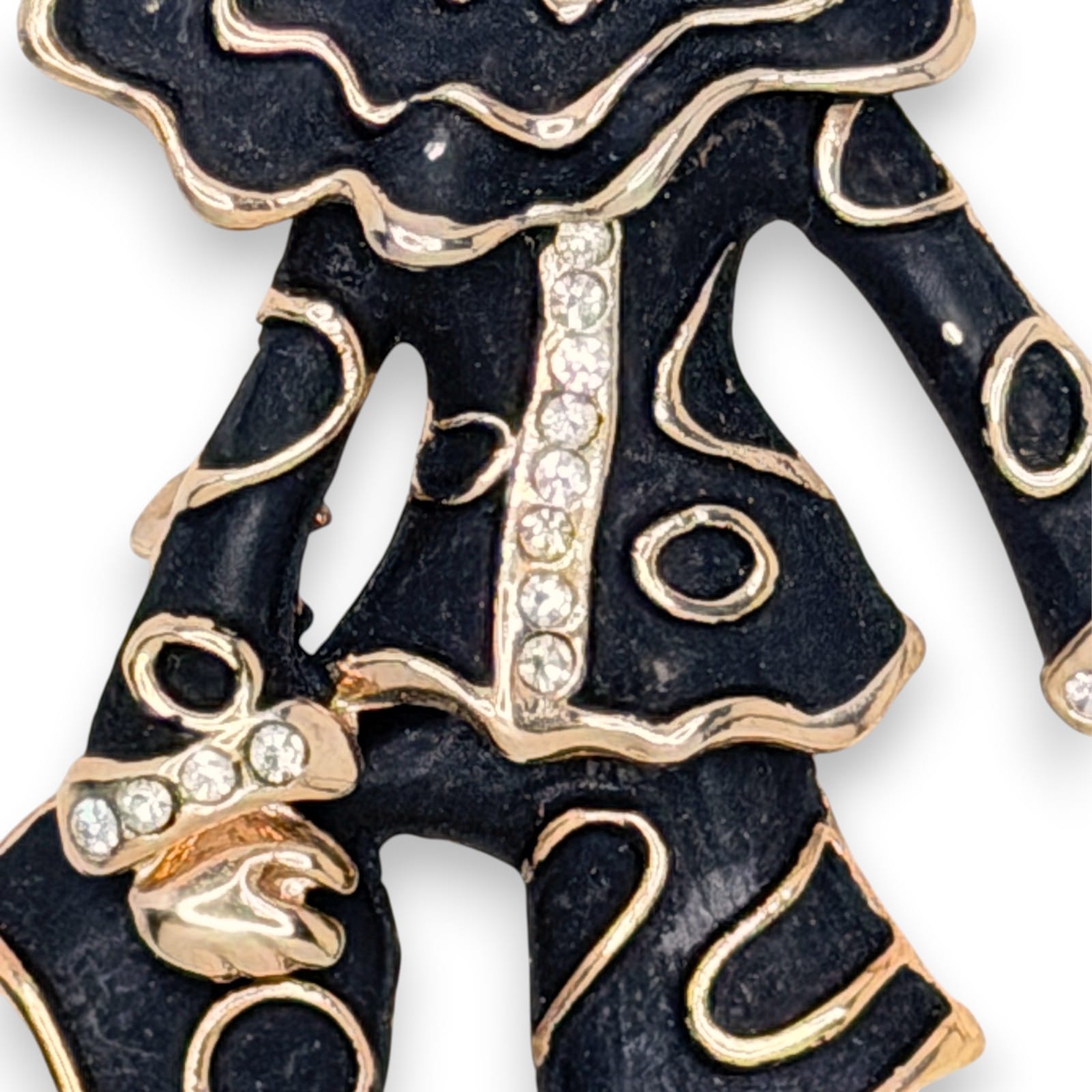1970s Articulated Clown Figural Brooch Black Enamel Rhinestone Gold Tone Pin