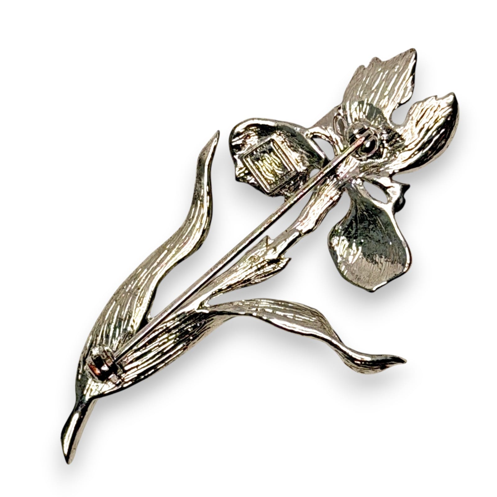Late-20th-century Fish & Crown enamel brooch in the form of a purple iris with green leaves. The design reflects an Art Nouveau revival influence with flowing lines and translucent enamel over a silver tone base.