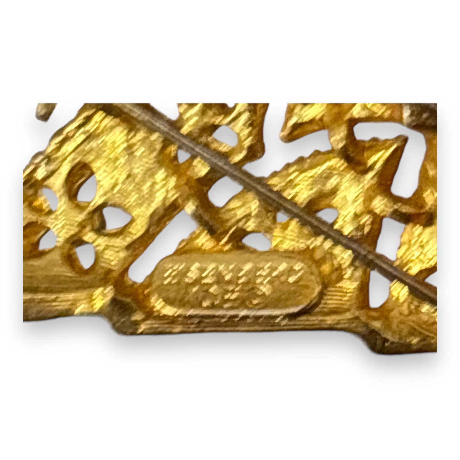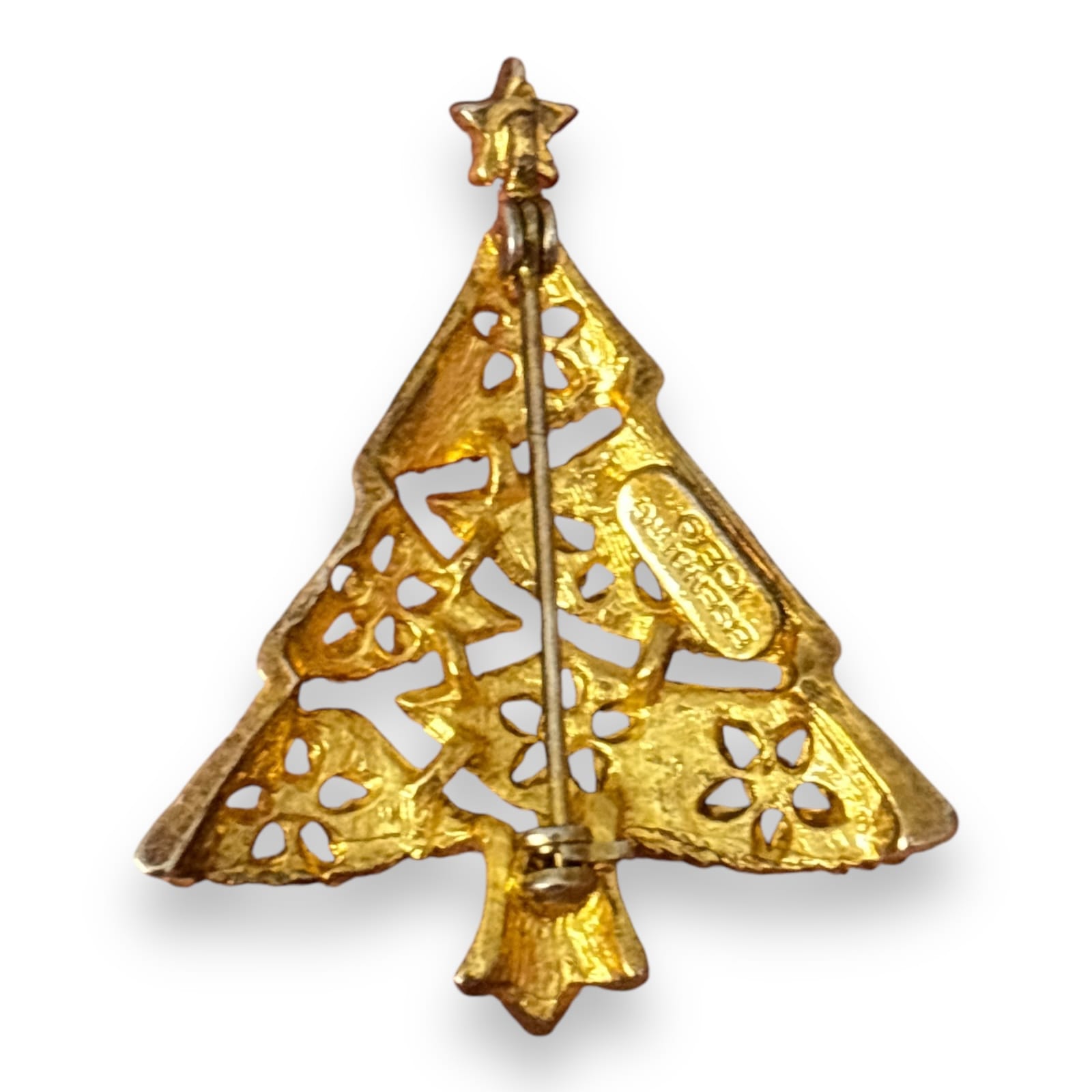 This lot is a beautifully preserved Christmas tree figural brooch with multi-color ornaments. None of the stones are missing or damaged in any way. The brooch is 1.75″ tall by 1.25″ wide.