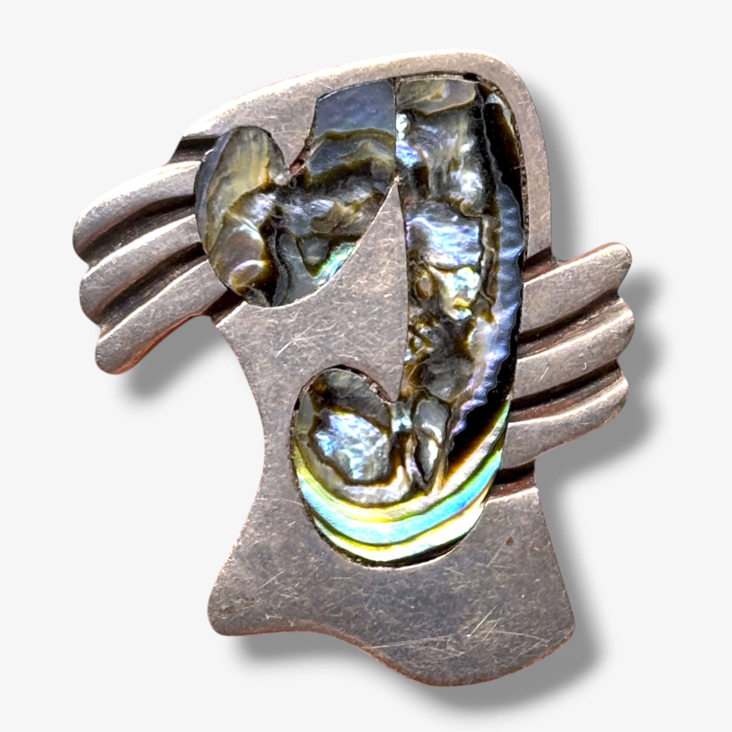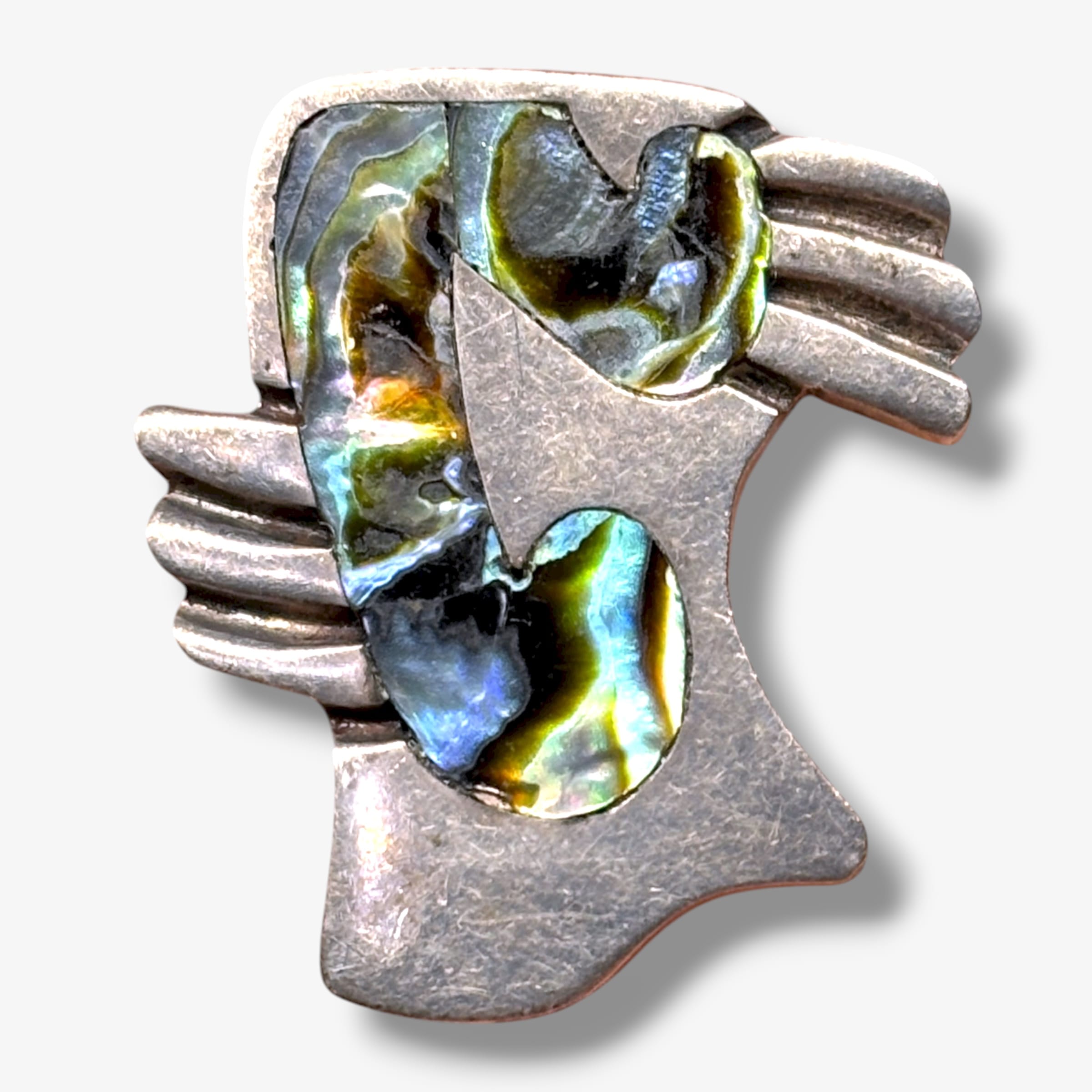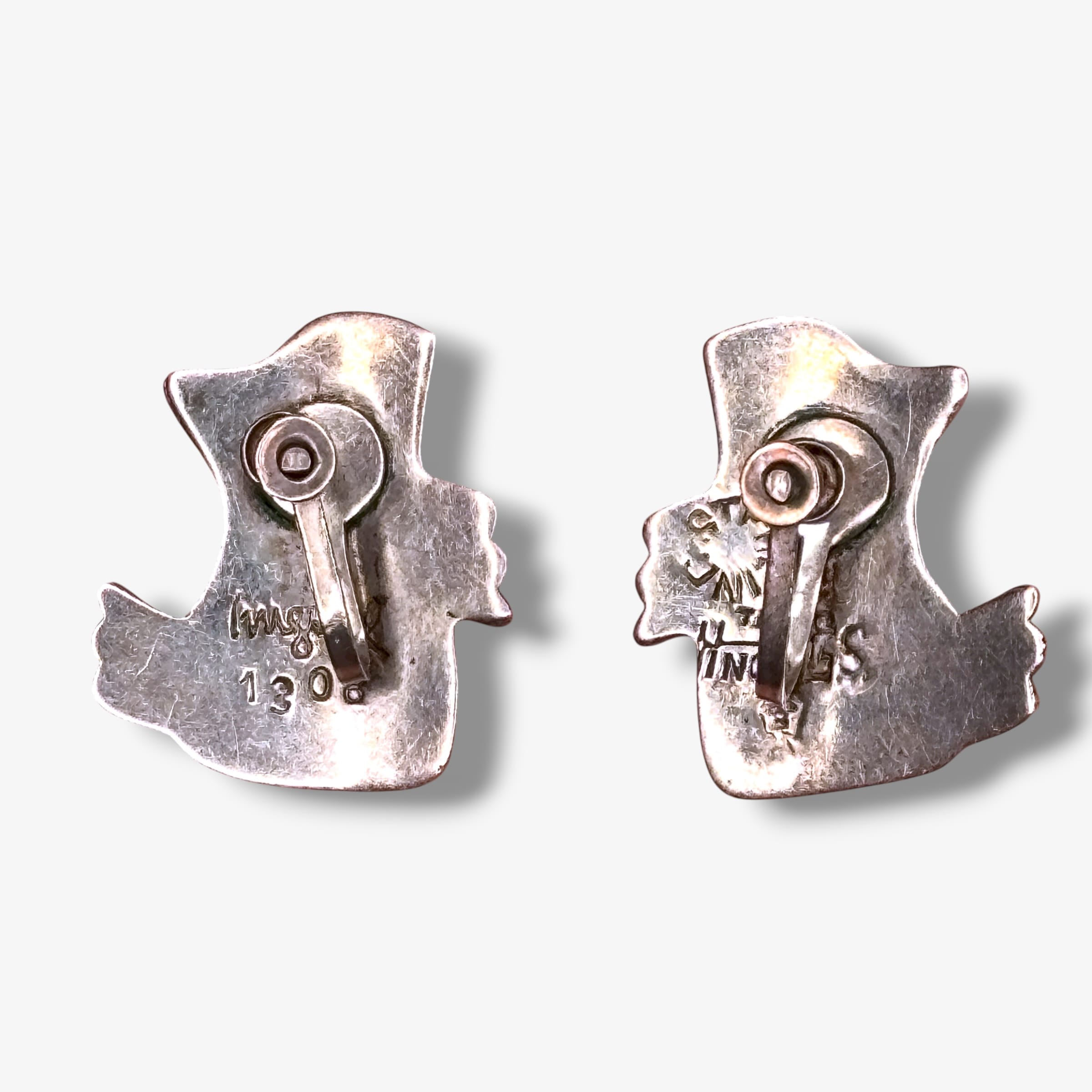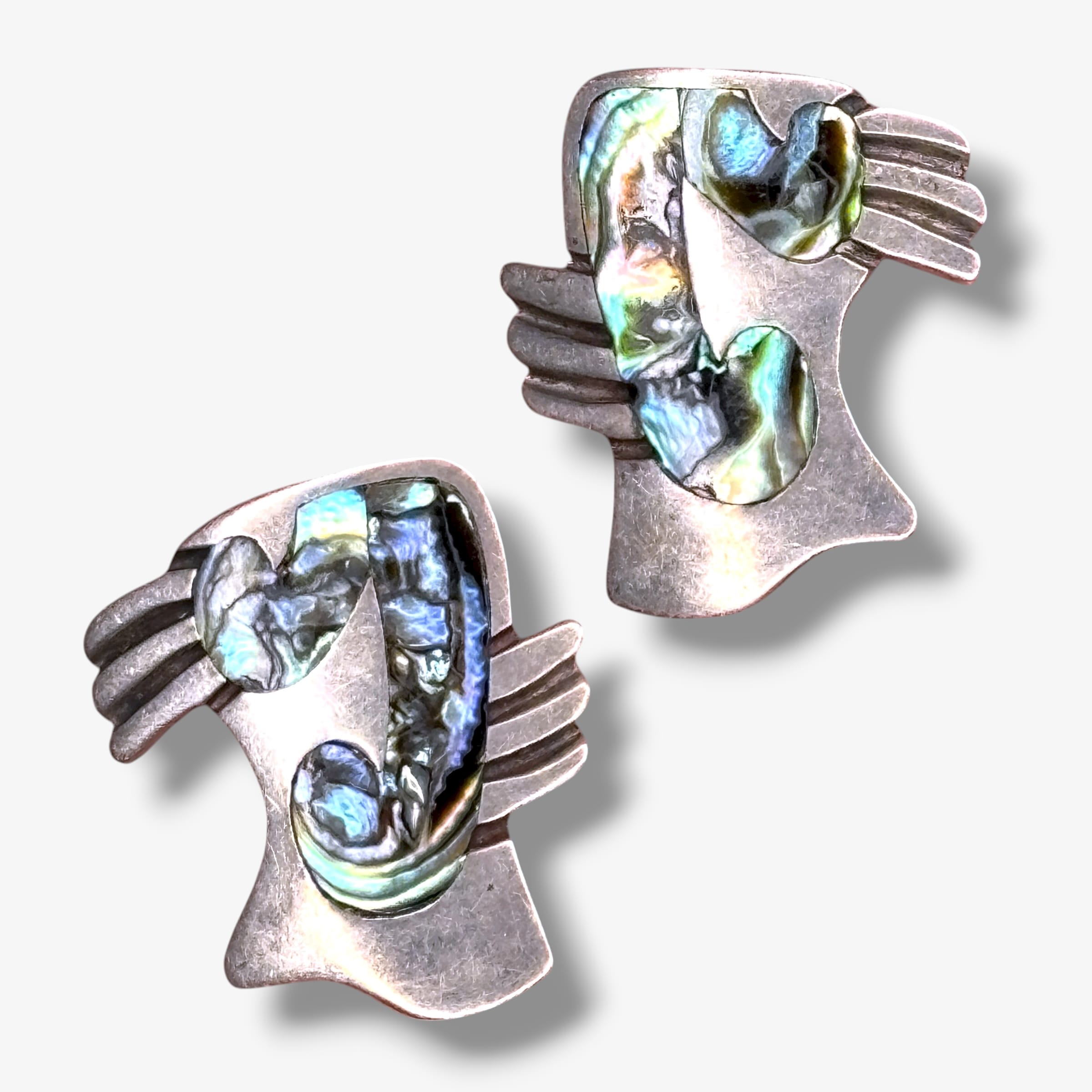 These vintage 1950s Taxco Mexico earrings by Miguel Garcia Martinez feature sculptural sterling silver forms inlaid with luminous abalone shell. Each is hand-wrought with the maker’s mark “Miguel 1308,” the “Sterling Taxco Mexico” stamp, and a partial eagle assay mark indicating mid-century Taxco origin. The design reflects Garcia Martinez’s modernist interpretation of organic and Aztec-inspired shapes, displaying deep iridescent blues and greens in the shell against oxidized silver surfaces.