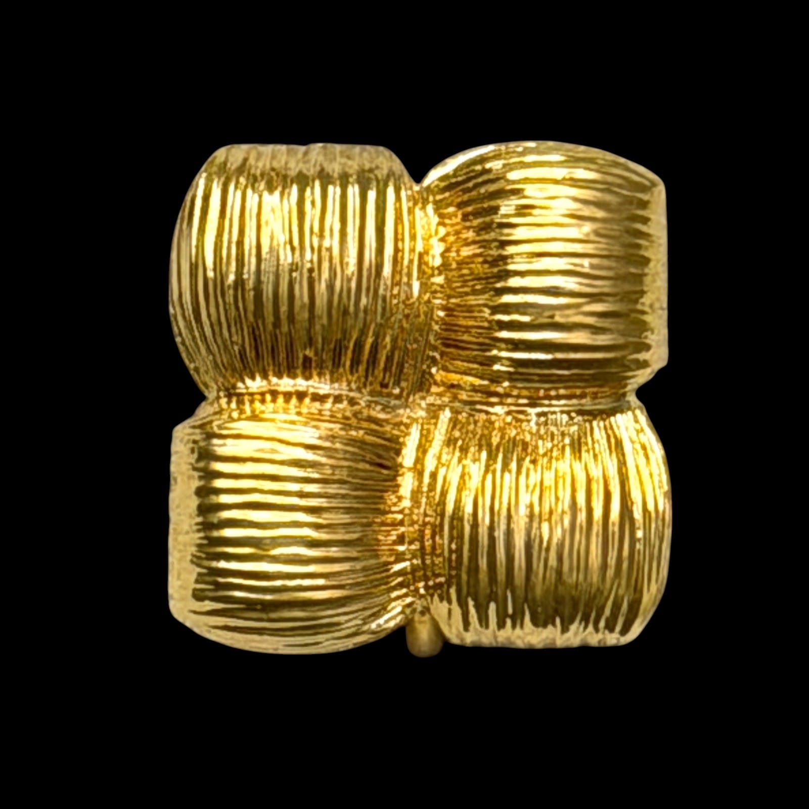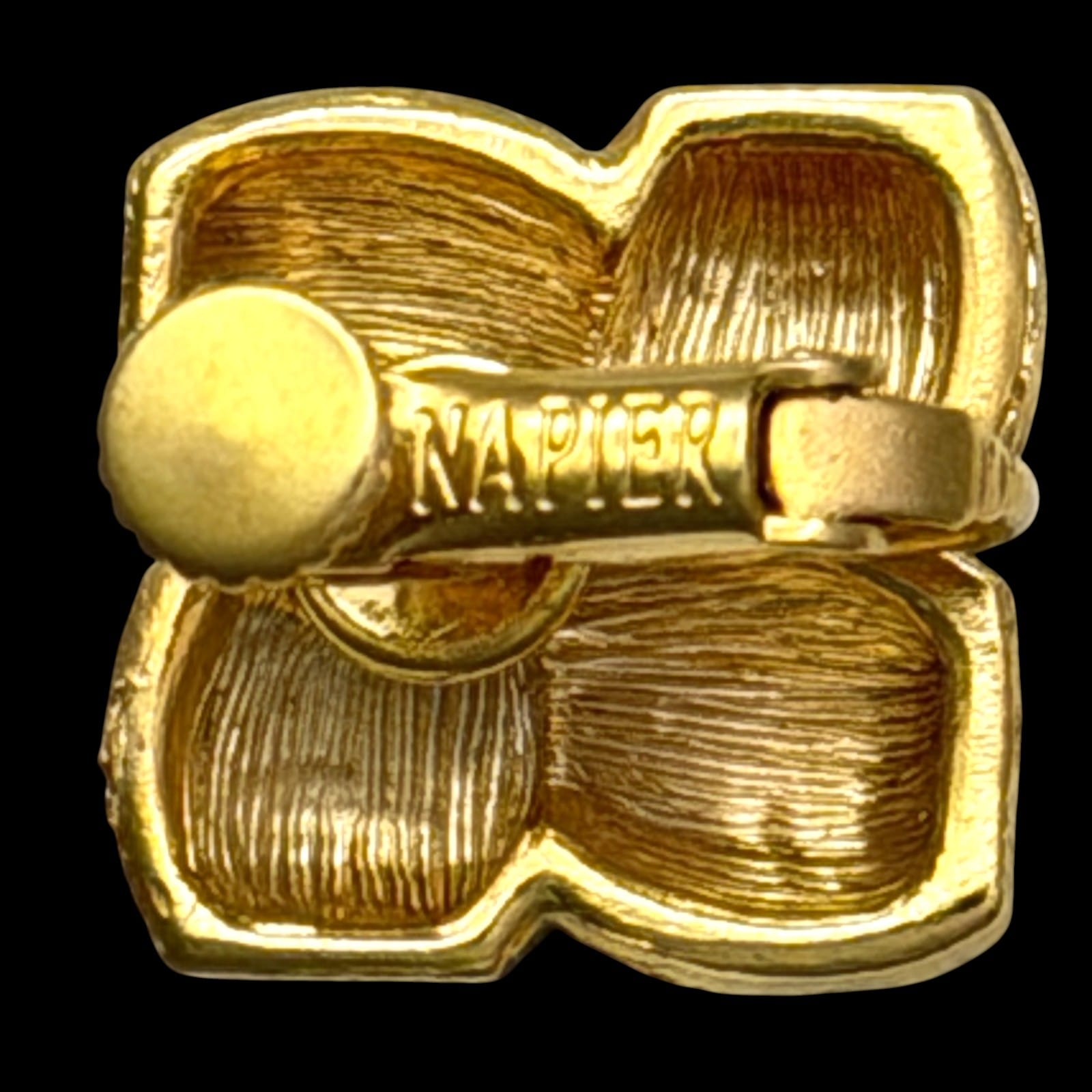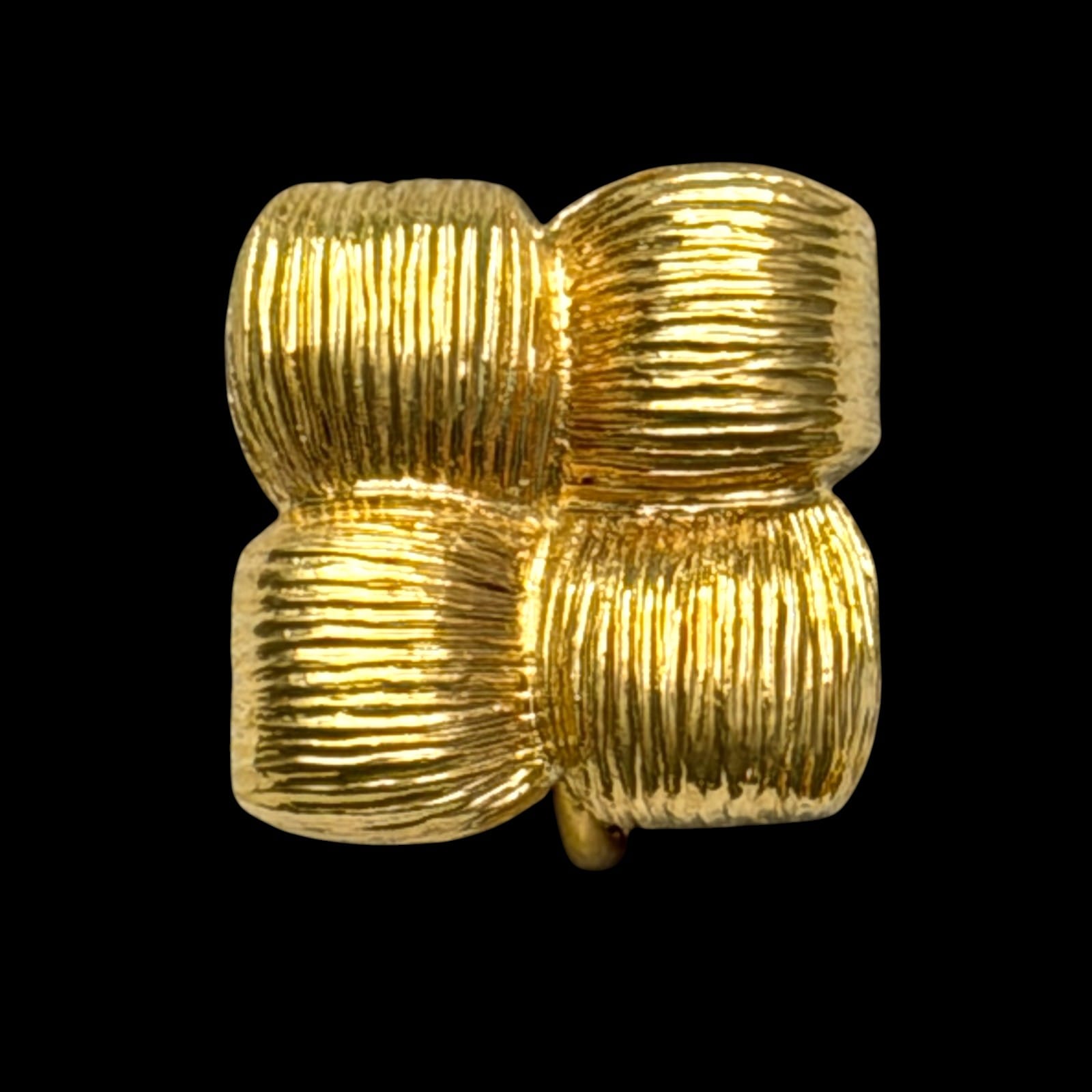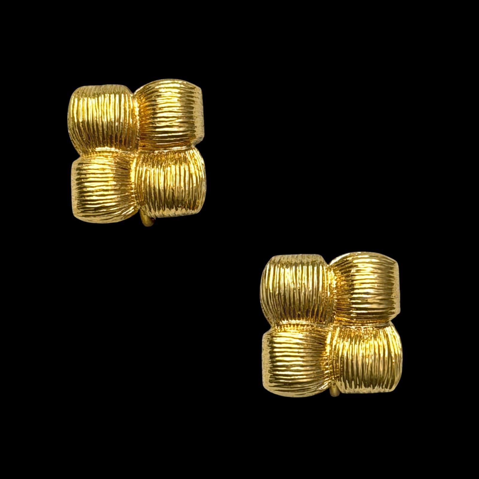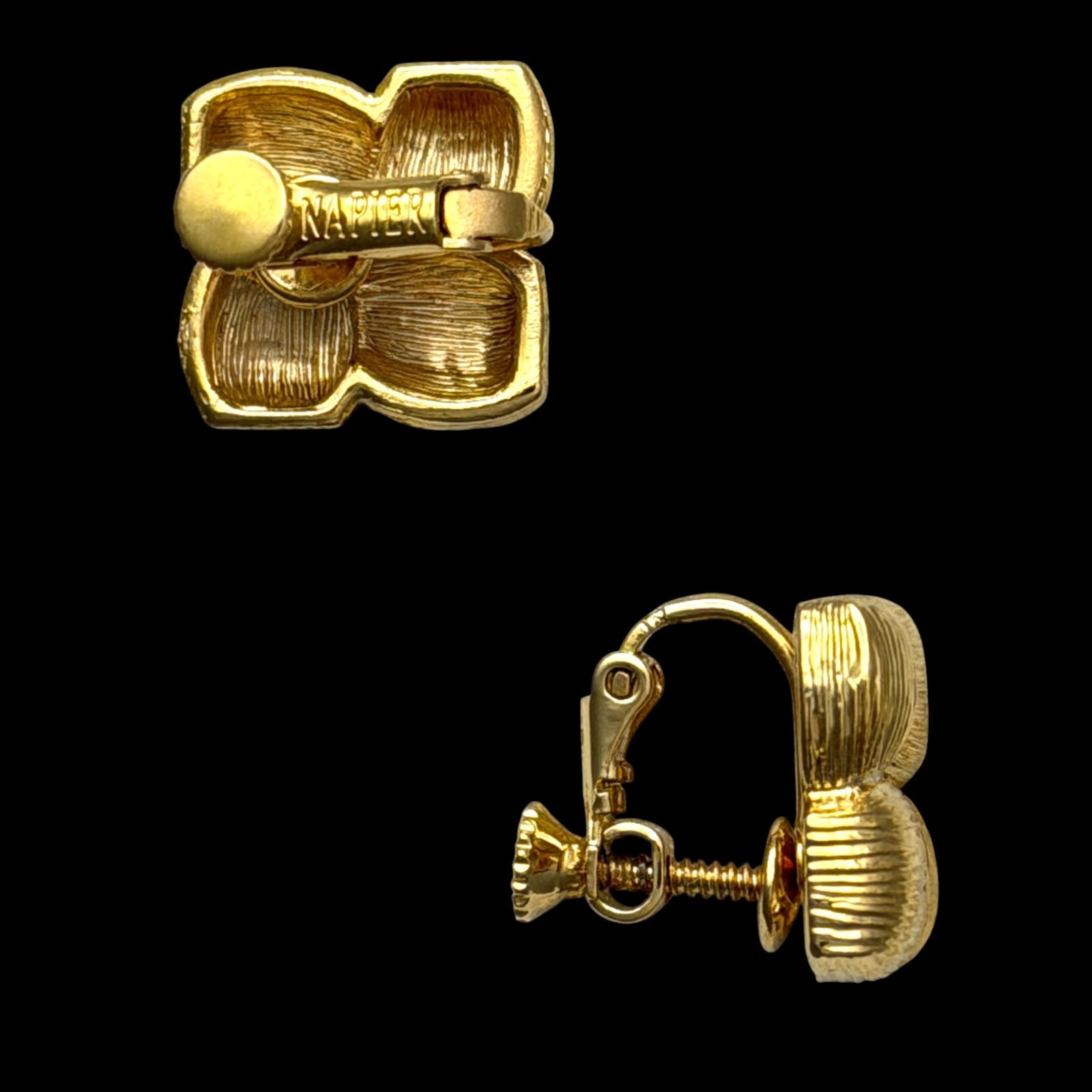 Vintage Napier screwback clip earrings in a mid-century geometric basketweave design. The face is a square of four ribbed cushion blocks in bright gold-tone. Each earring is signed Napier on the lever.
