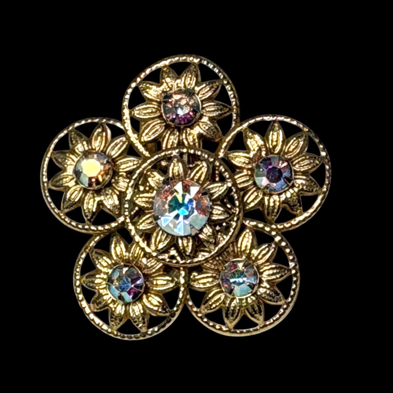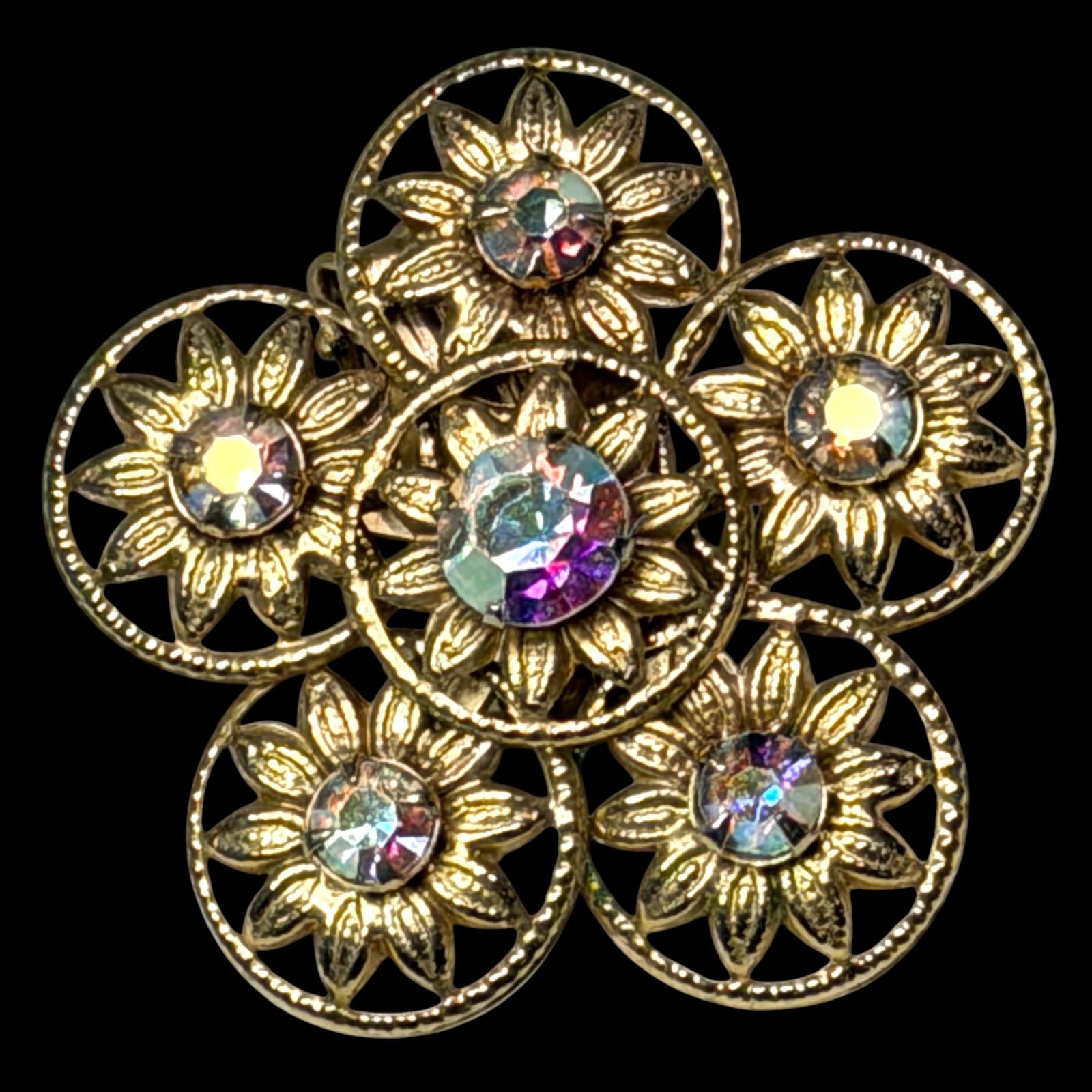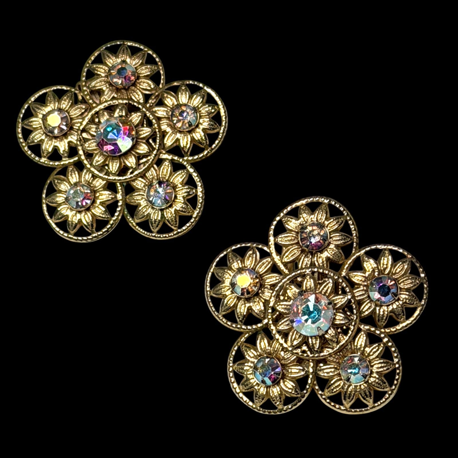 Mid-century 1950s gold-tone filigree flower cluster clip-on earrings with aurora borealis rhinestones. The design uses five openwork floral rosettes around a central rosette. The stones flash multicolor under light and sit in raised settings for depth.