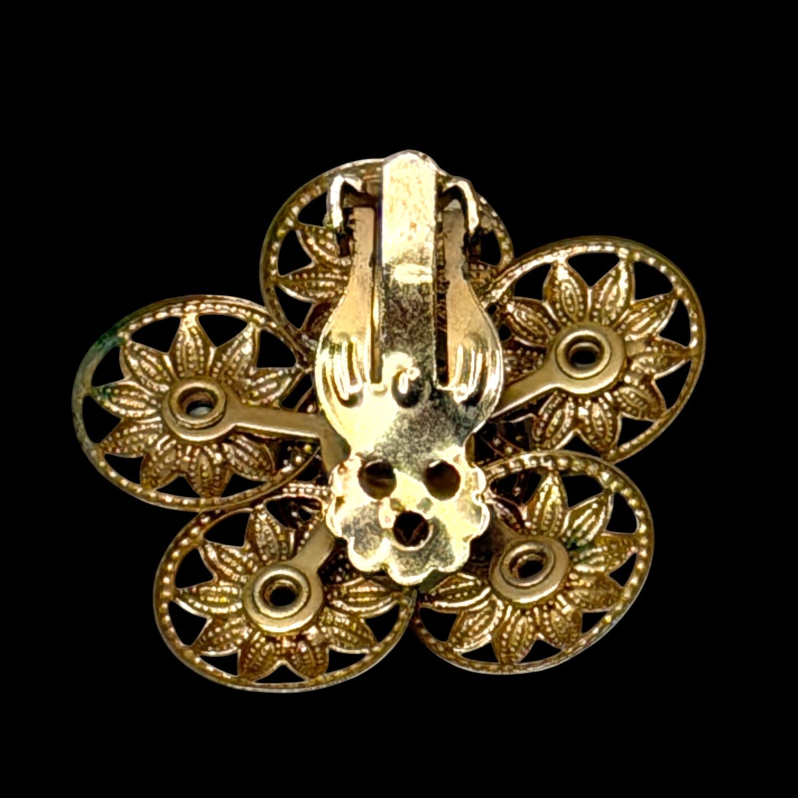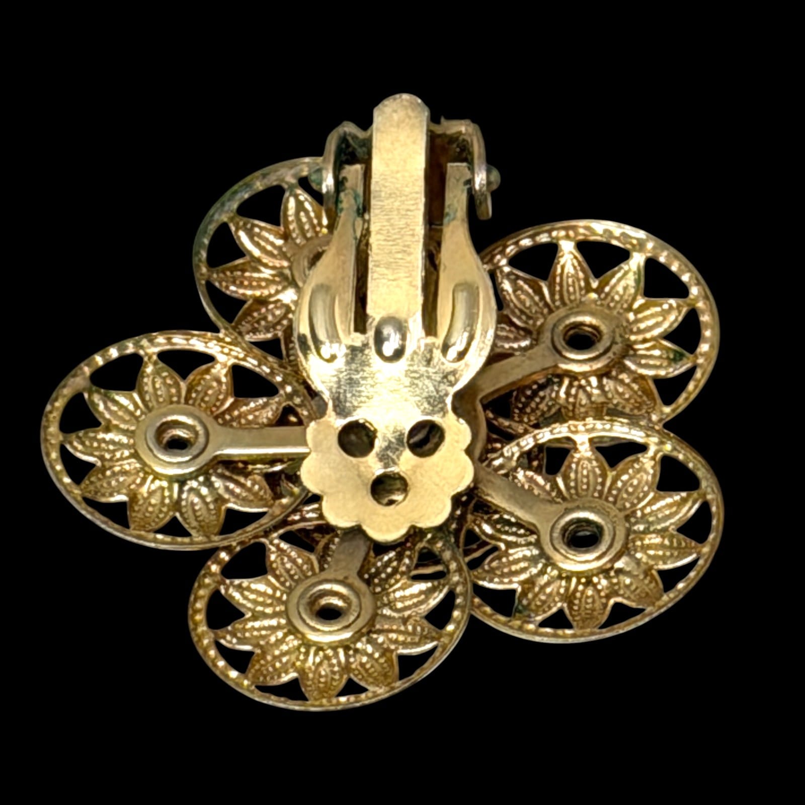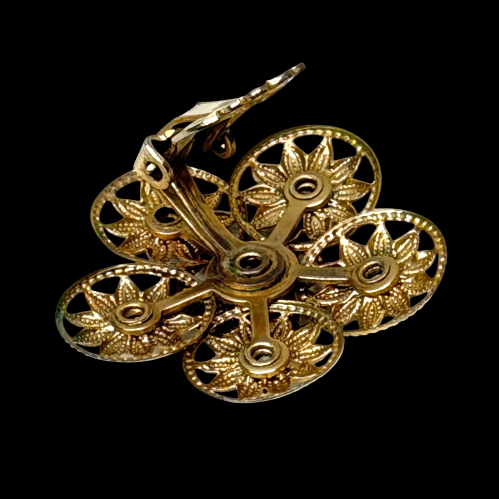 Mid-century 1950s gold-tone filigree flower cluster clip-on earrings with aurora borealis rhinestones. The design uses five openwork floral rosettes around a central rosette. The stones flash multicolor under light and sit in raised settings for depth.