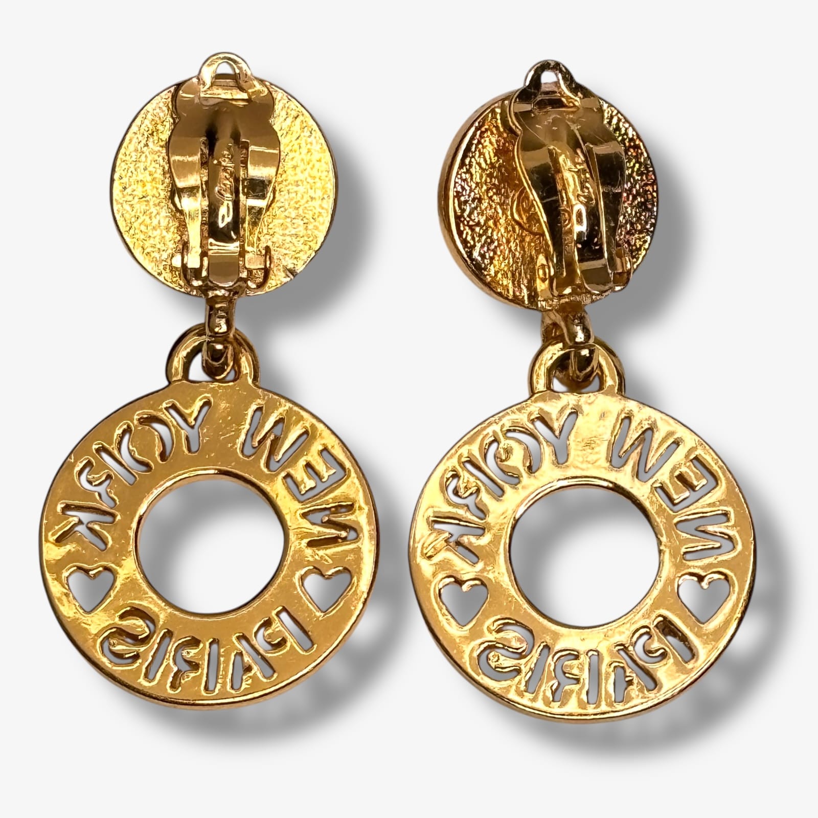 These signed Carolee earrings date to the c.1990s era and feature cream faux pearl tops with gold tone openwork dangles reading New York and Paris, combining a travel theme with classic styling.