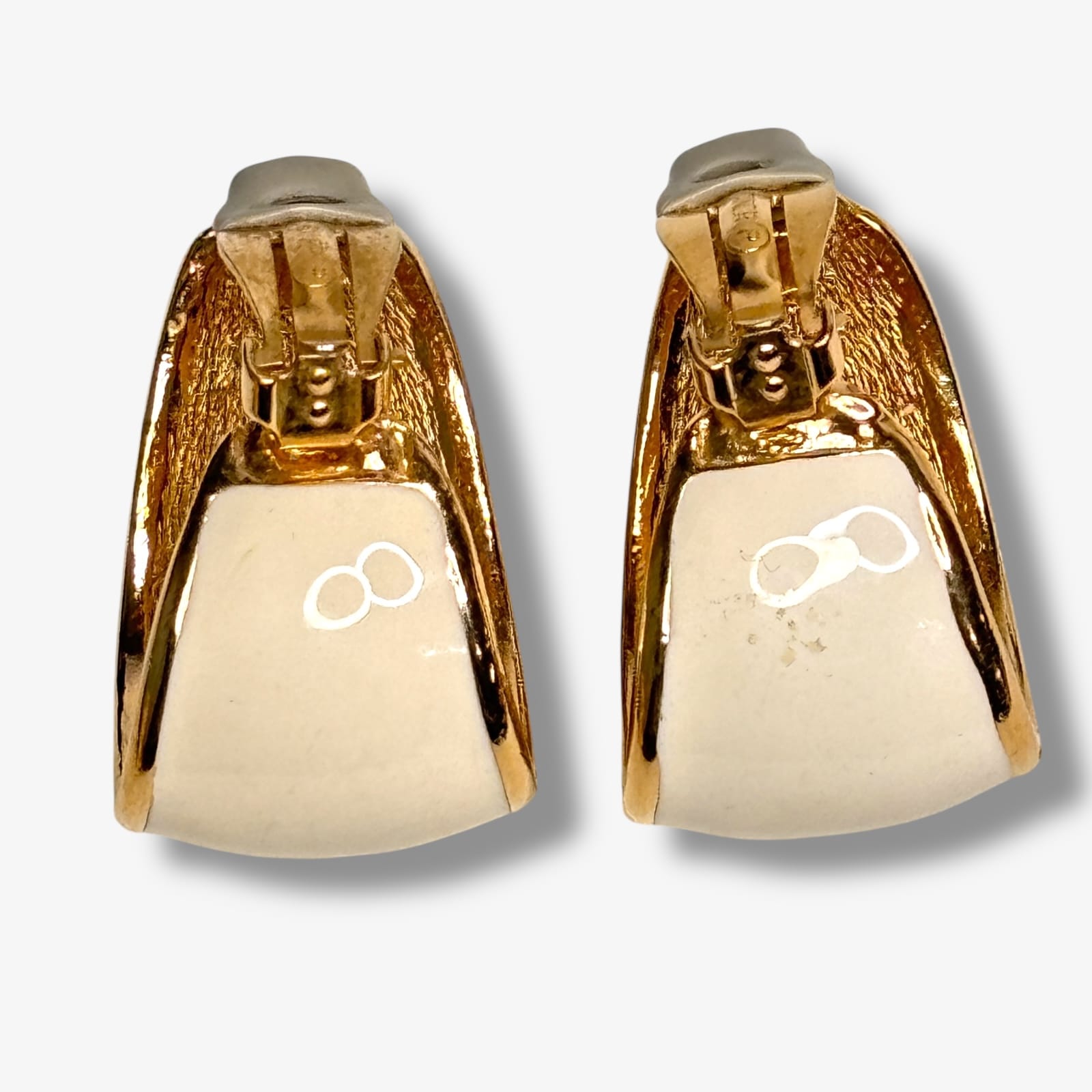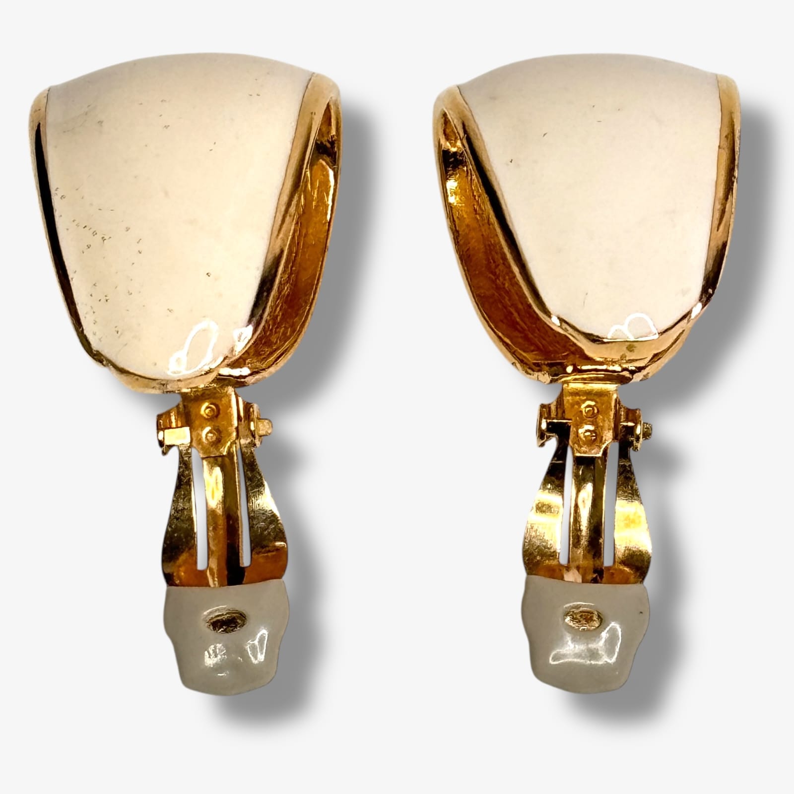 Ciner c.1980s Cream Enamel Gold Tone Sculpted Clip On Earrings Vintage Designer