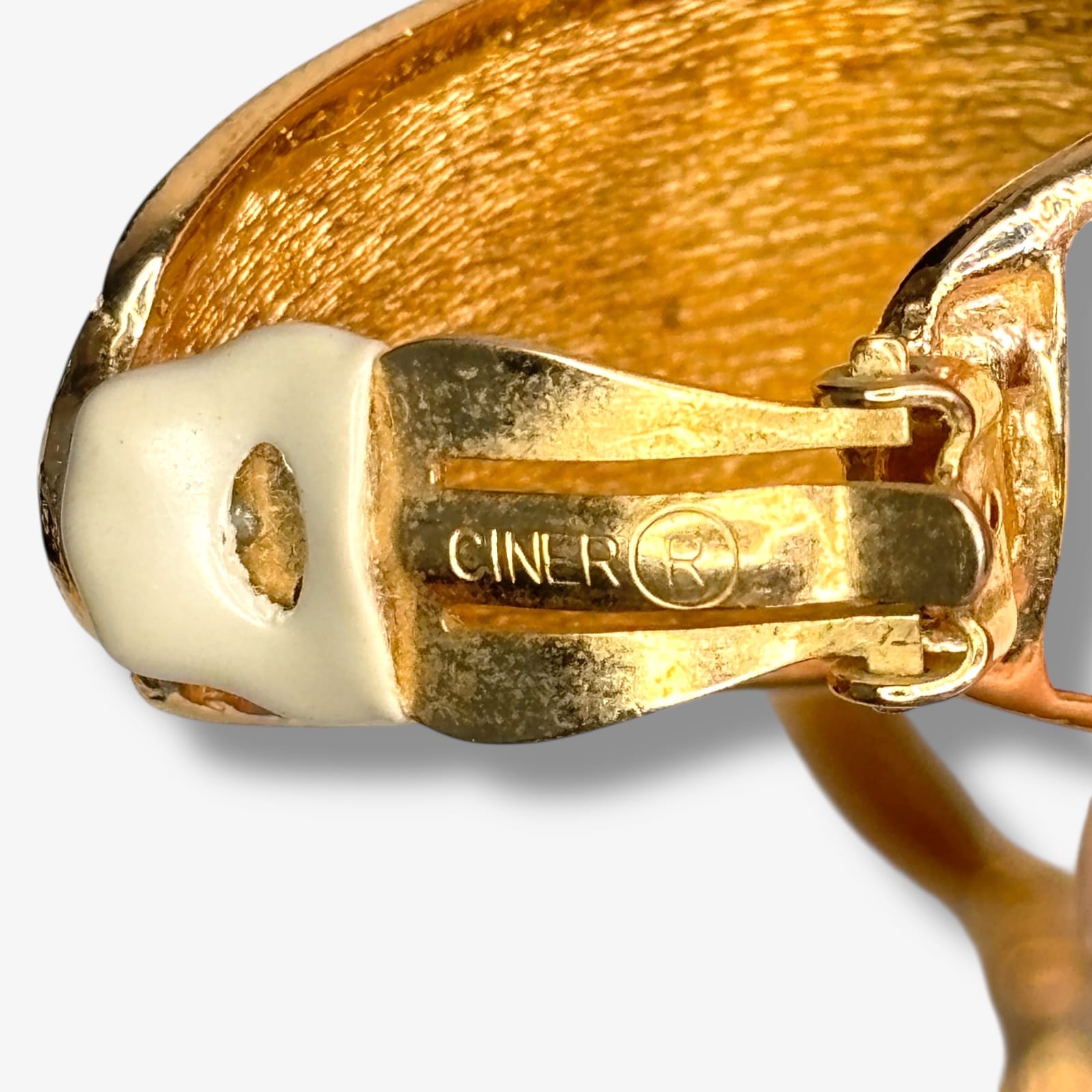 These vintage Ciner earrings from c.1980s feature sculpted gold tone metal with glossy cream enamel panels. The clips are marked and fully functional, and the design reflects the high-quality construction typical of Ciner pieces.