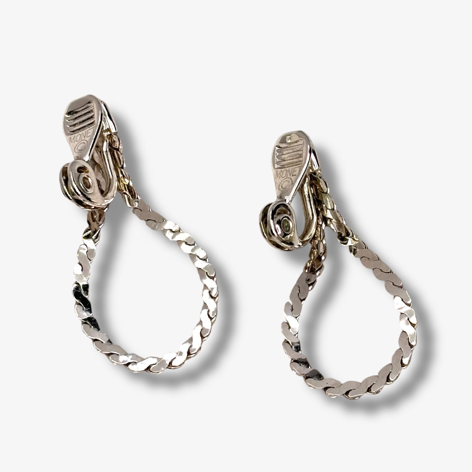 Vintage MONET Silver Tone Clip-On Twisted Chain Loop Dangle Earrings c.1970s