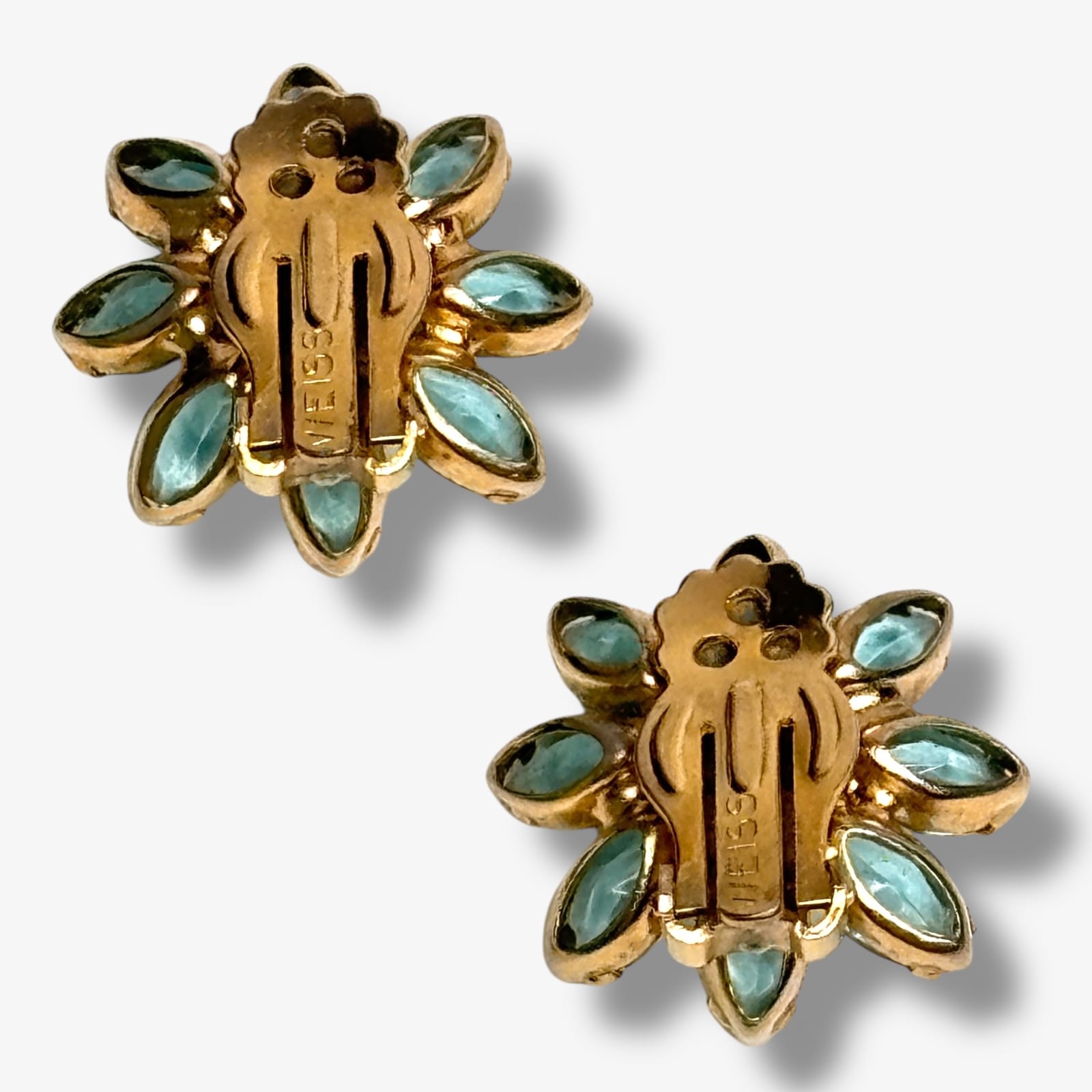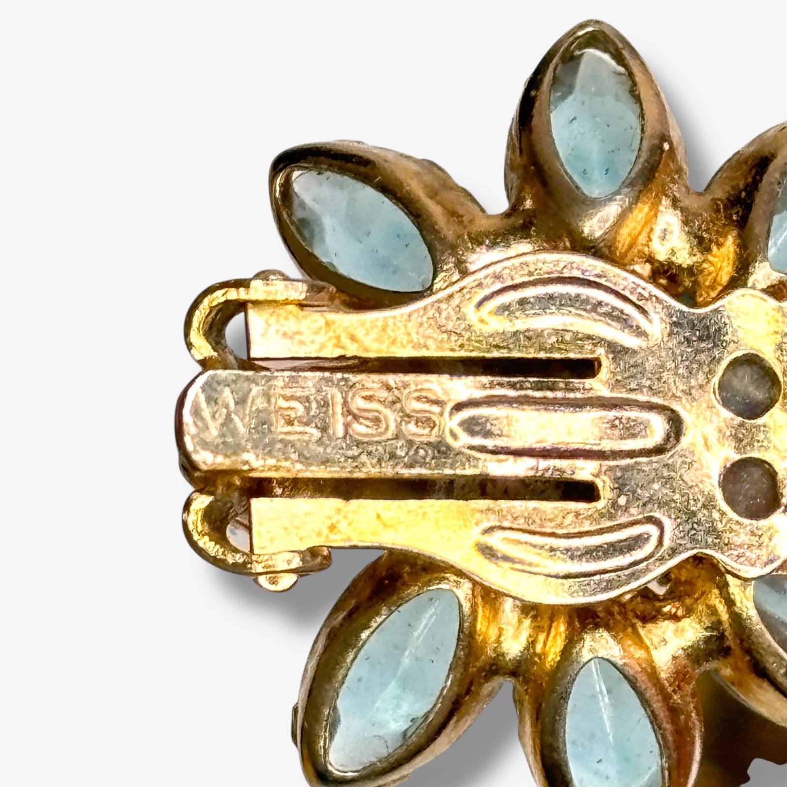 These signed Weiss clip-on earrings date to the 1950s and feature aqua glass navette stones surrounding green-leaning central chatons that flash yellow in direct light, forming a classic mid-century floral design.