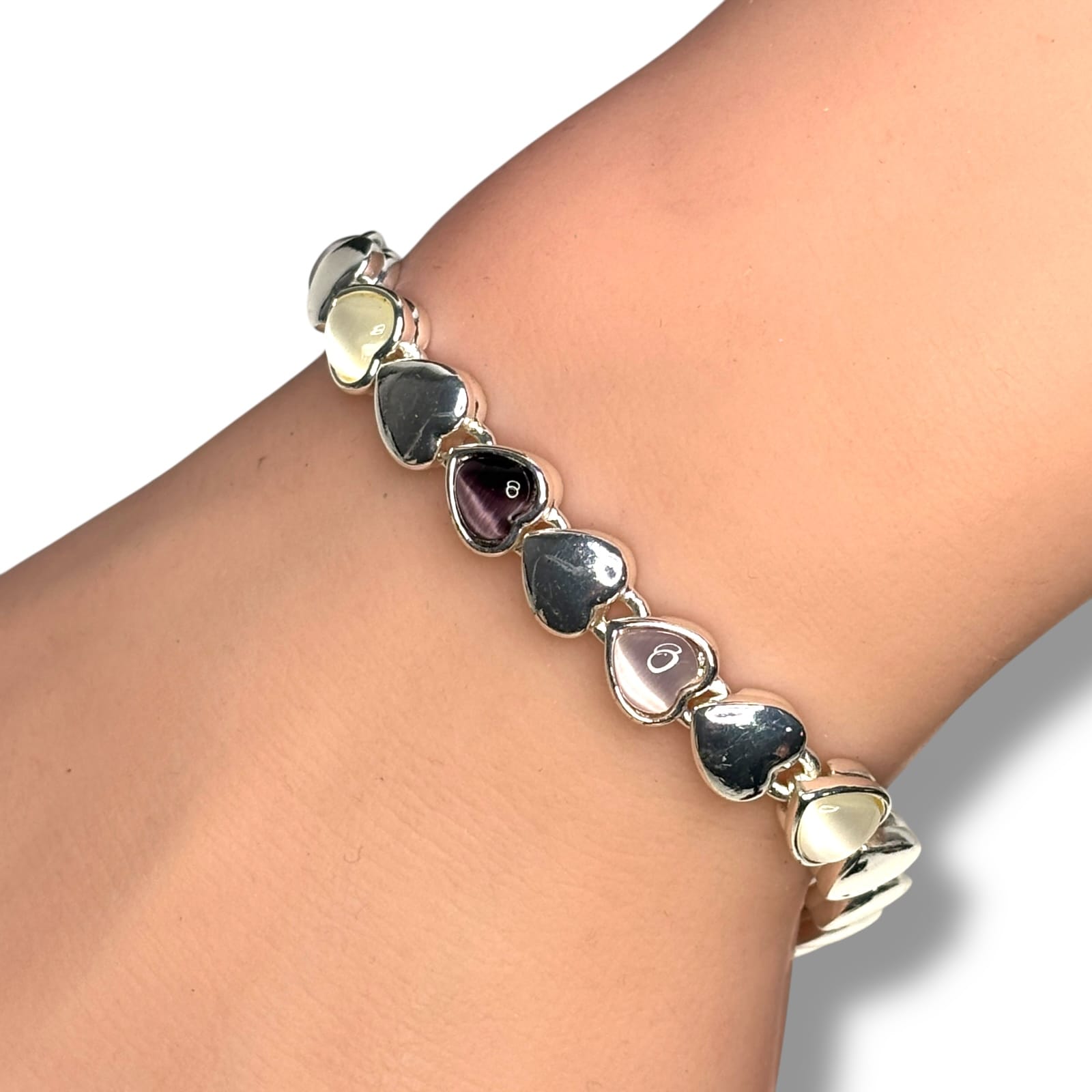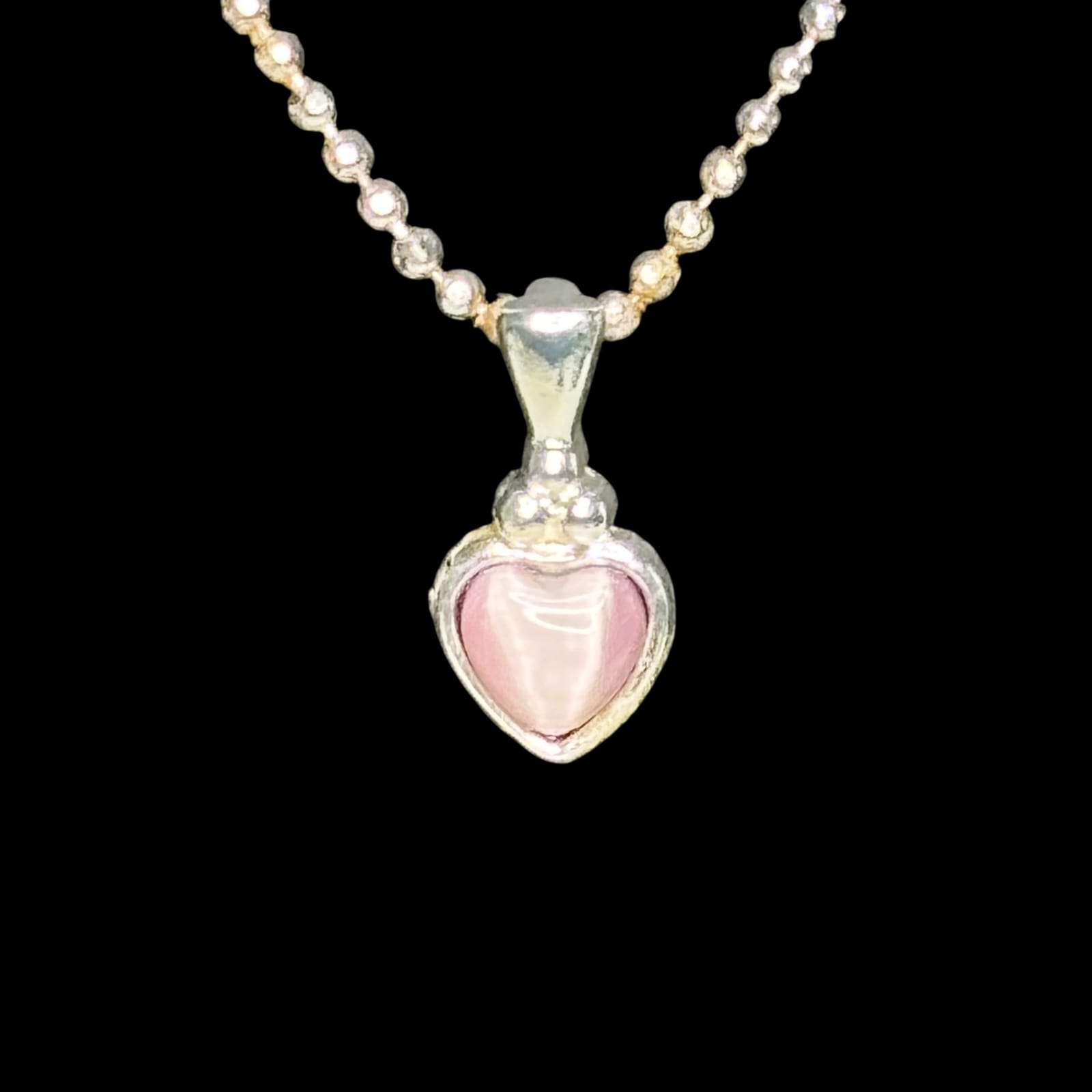 This three-piece vintage Roman Jewelry set from the c.1990s includes a 17″ ball chain necklace with a pink enamel heart pendant, a 7″ link bracelet featuring alternating pastel enamel heart links, and a pair of hook pierced earrings with matching pink enamel hearts. Each piece is silver tone and marked ROMAN on the reverse, showing the coordinated style and quality typical of late 20th-century costume jewelry by this maker.