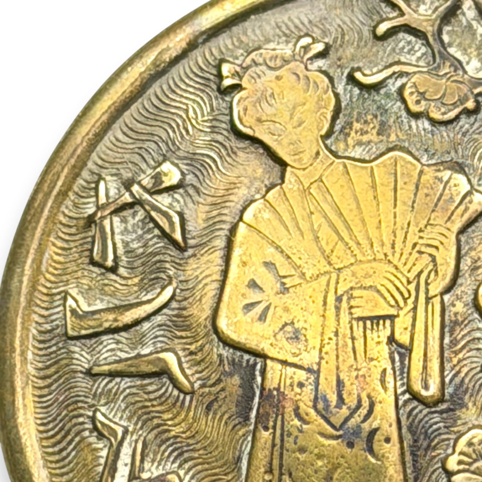 This 1950s Japanese brass belt loop buckle features a kimono-clad female figure beneath flowering branches with surrounding kanji characters in raised relief. The circular 41mm form and textured background are characteristic of mid-century Japanese export accessories produced for Western fashion markets during the post-war era.