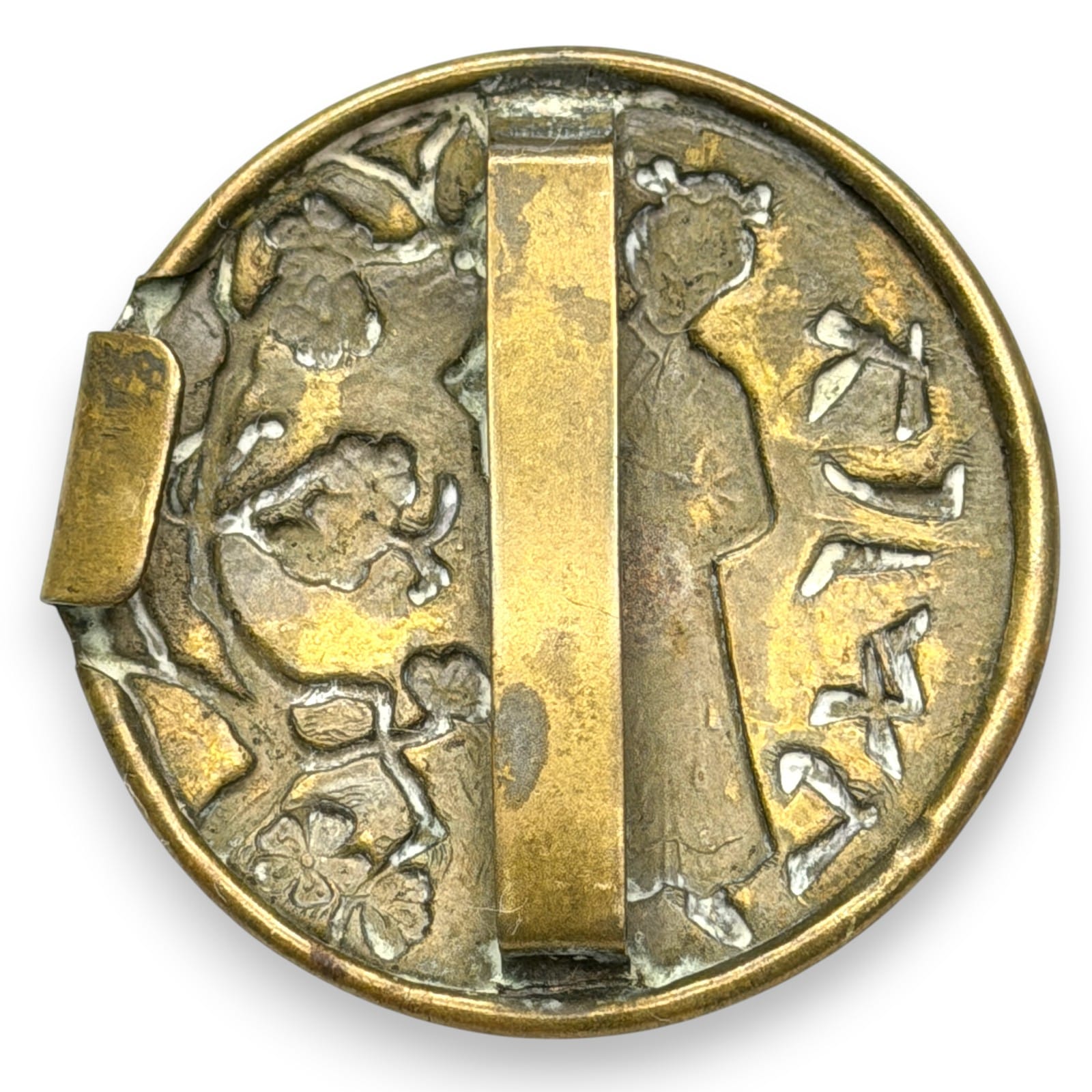1950s Japanese Brass Geisha Floral Belt Loop Buckle 41mm Kanji Characters Relief