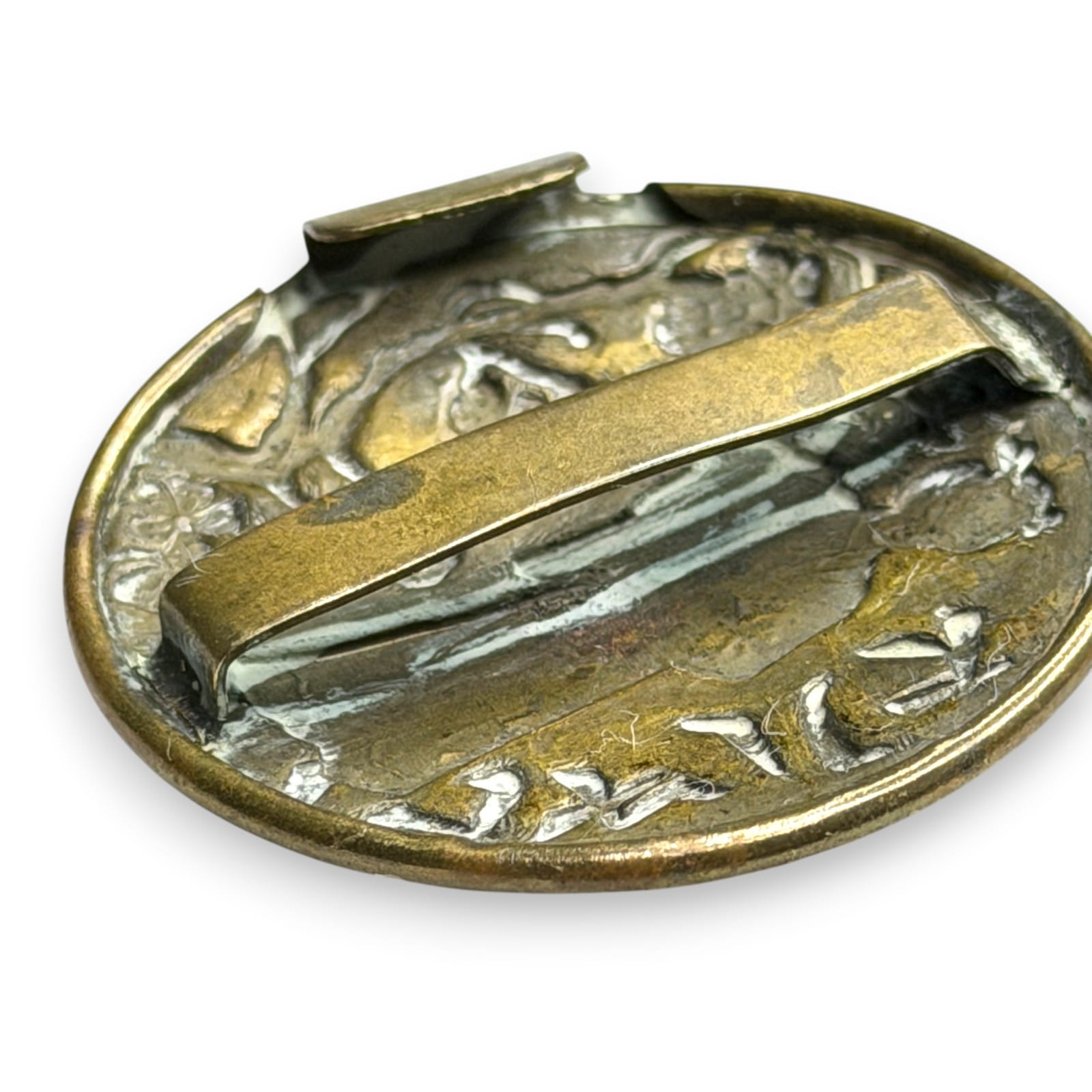 This belt buckle is in good condition. The brass is slightly worn but the image is still very clear. Please review the included photos of the actual item to make a complete determination of its condition.