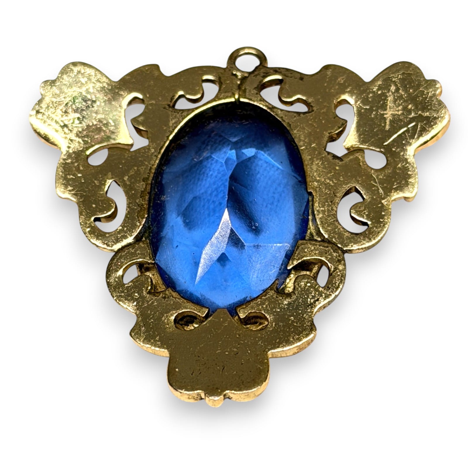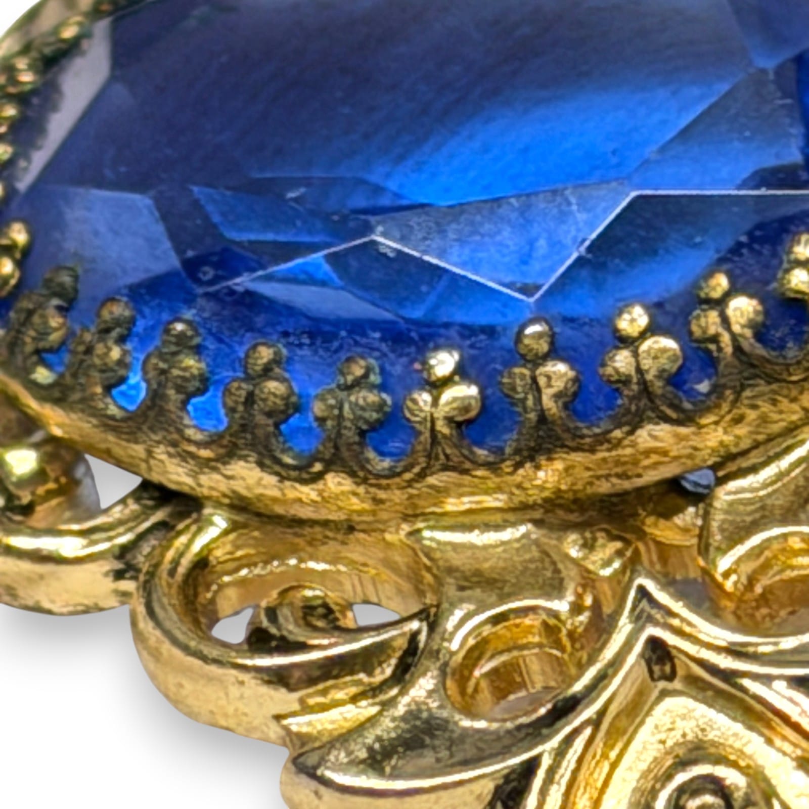 1960s Gold Tone Rococo Openwork Filigree Pendant 25mm Blue Faceted Glass Oval