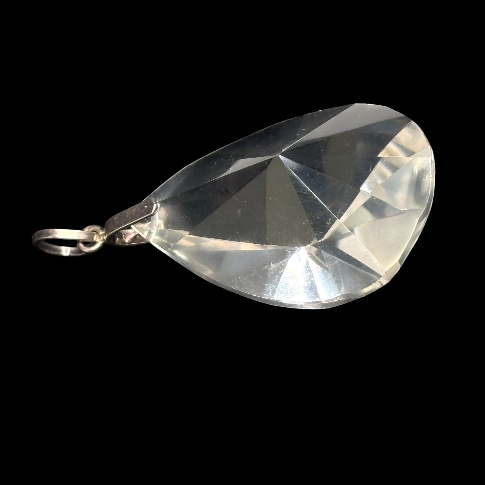 Mid-century faceted rock crystal teardrop pendant with a two-sided rivoli-style cut. The clear quartz body is fitted with a plain silver-tone metal bale and jump ring for easy use on a chain.