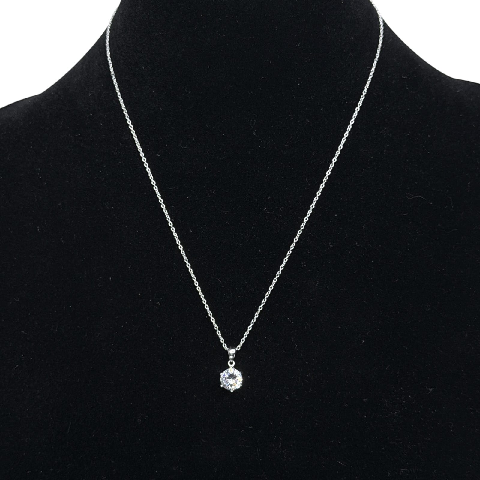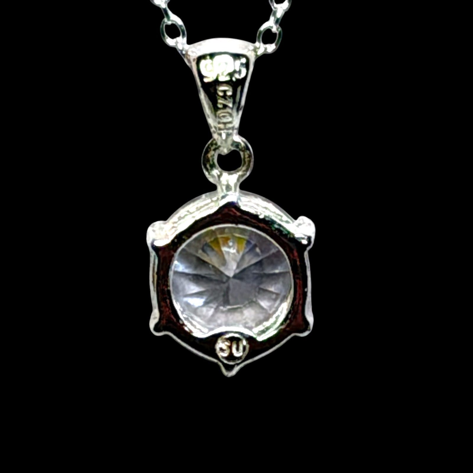 1990s sterling silver cable chain necklace with a round cubic zirconia solitaire pendant. The chain is marked 925 Italy SU at the tag and 925 at the spring ring clasp. The bale is marked 925 with SU on the pendant. The look is a classic diamond-style solitaire in a clean, minimal setting.