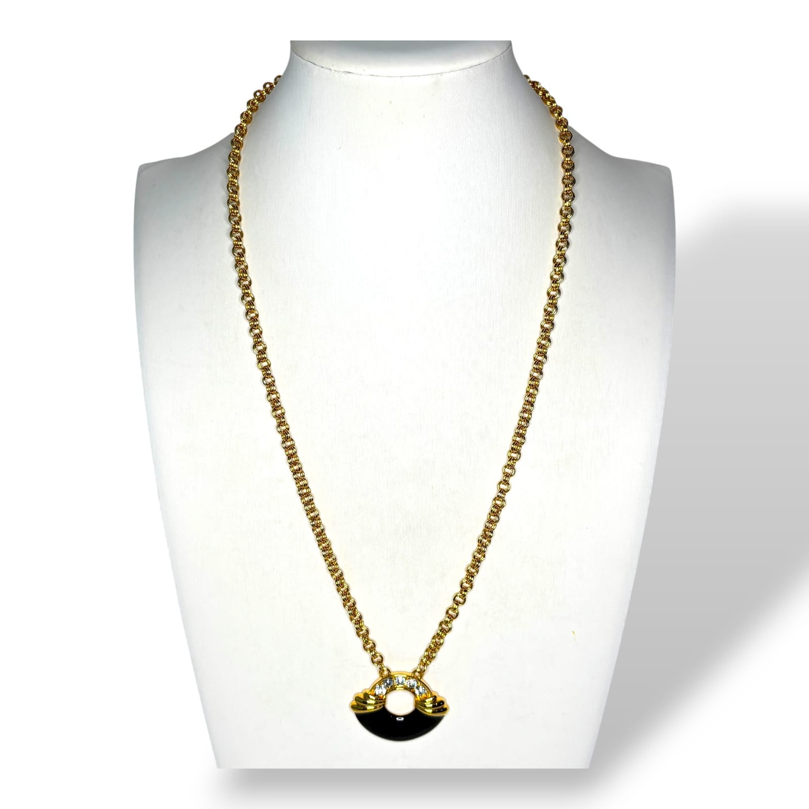 This vintage c.1980s Monet necklace features a bold gold tone chain with a circular pendant of black enamel accented by clear rhinestones. The pendant is marked Monet on the reverse and hangs from a 20 inch chain with a secure clasp. A striking piece of retro fashion jewelry suitable for both collectors and wear.