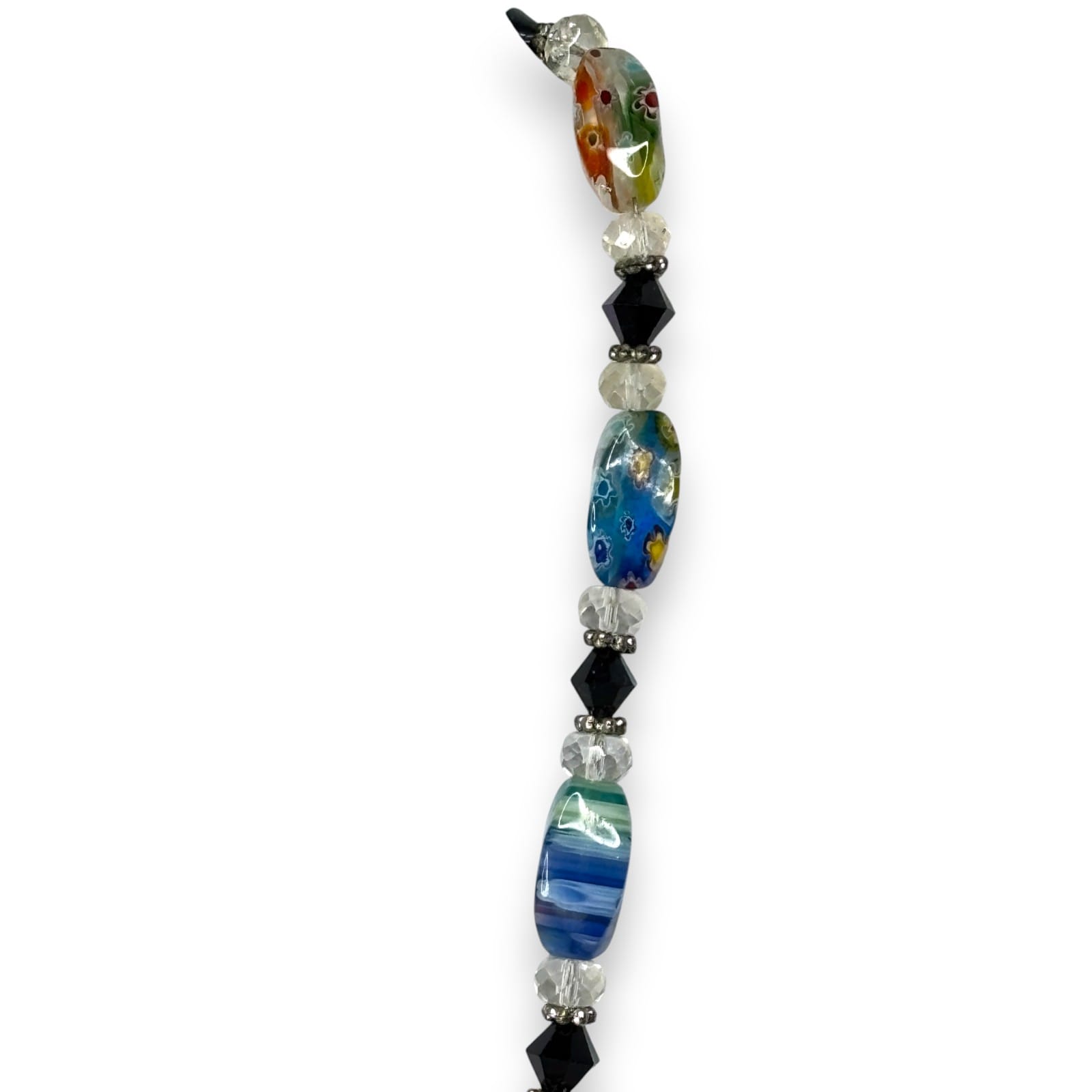 – Materials: millefiori-style art glass, faceted clear glass spacers, faceted dark glass beads, silver-tone metal findings