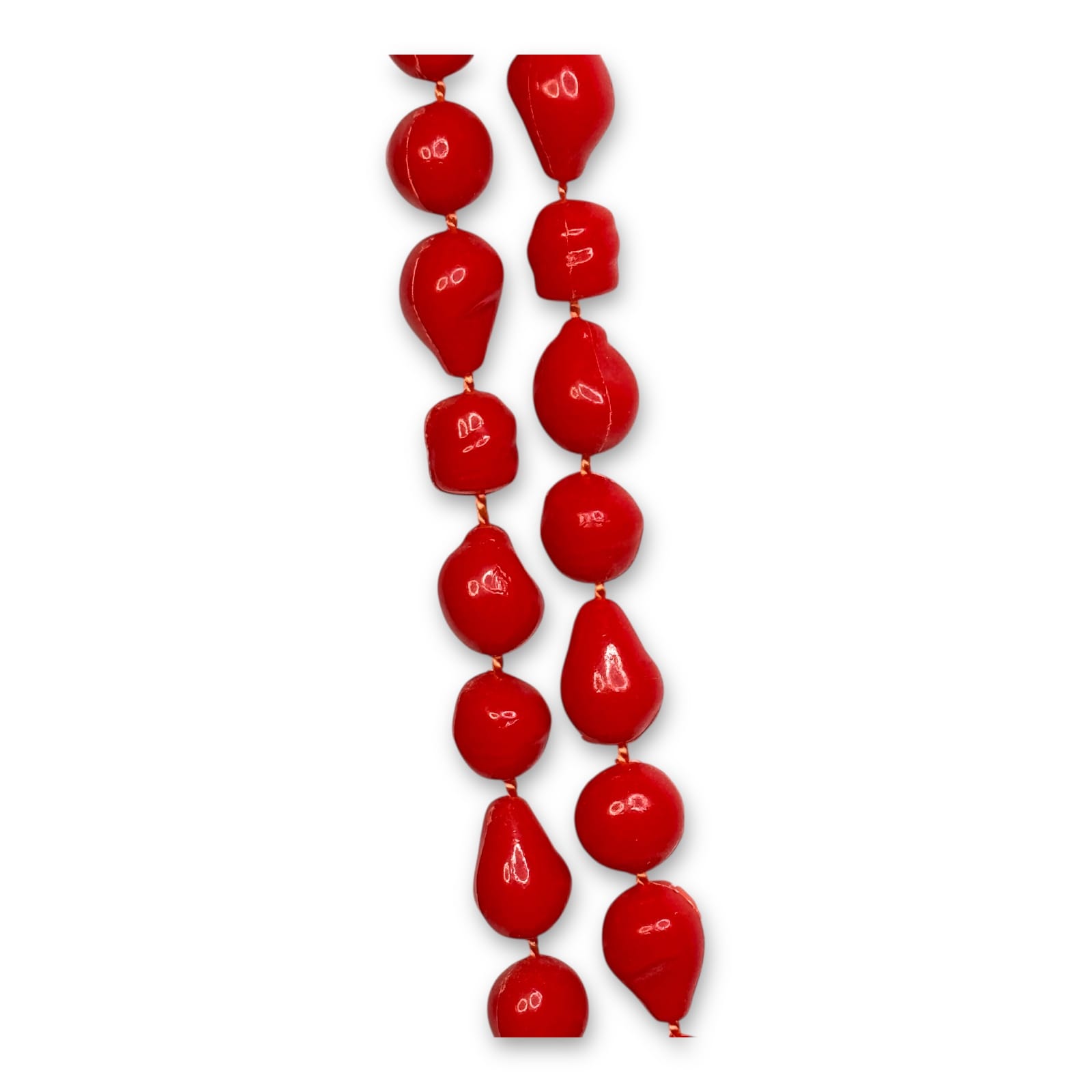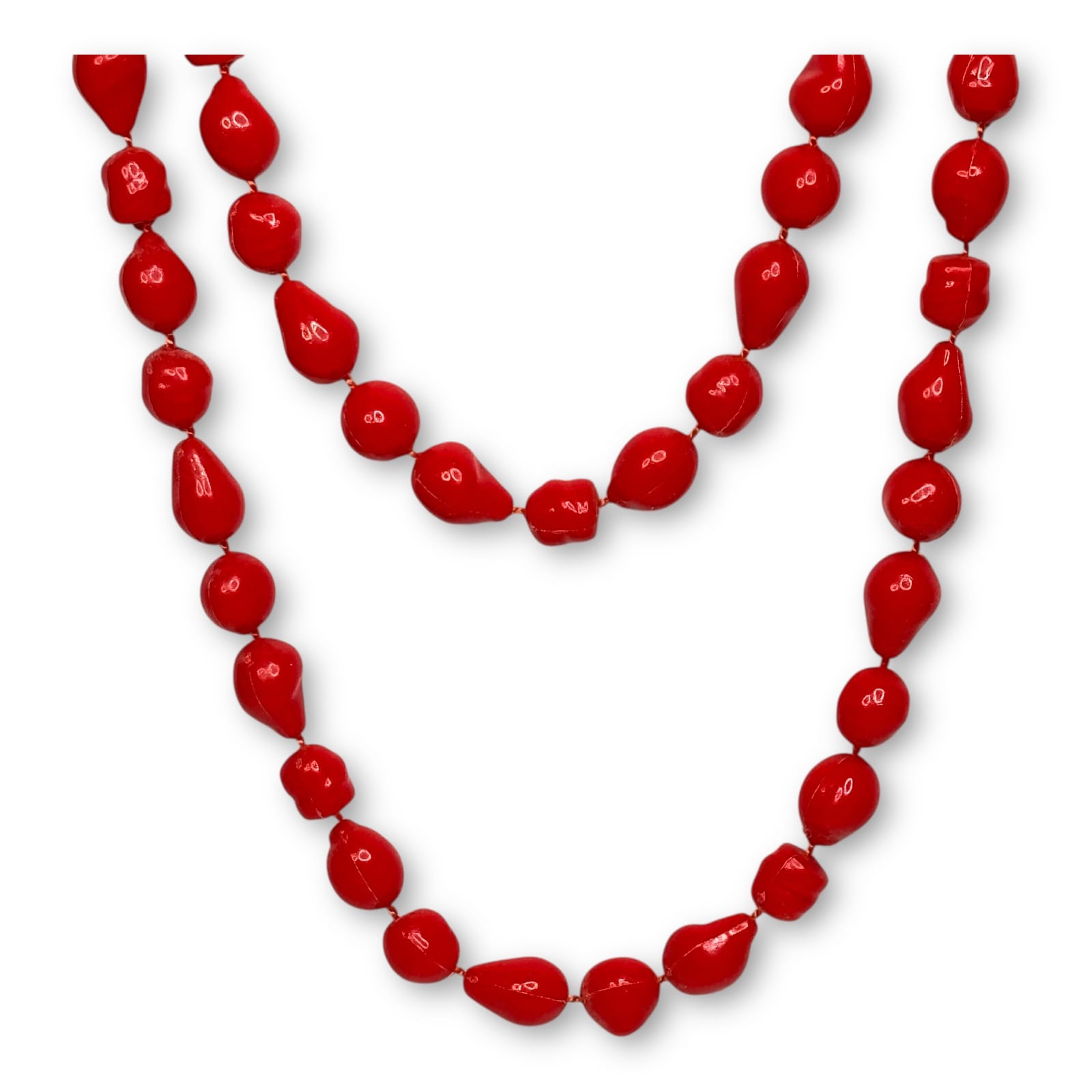 Mid-Century 1950s Red Plastic Knotted Mixed-Shape Bead Necklace Long Strand