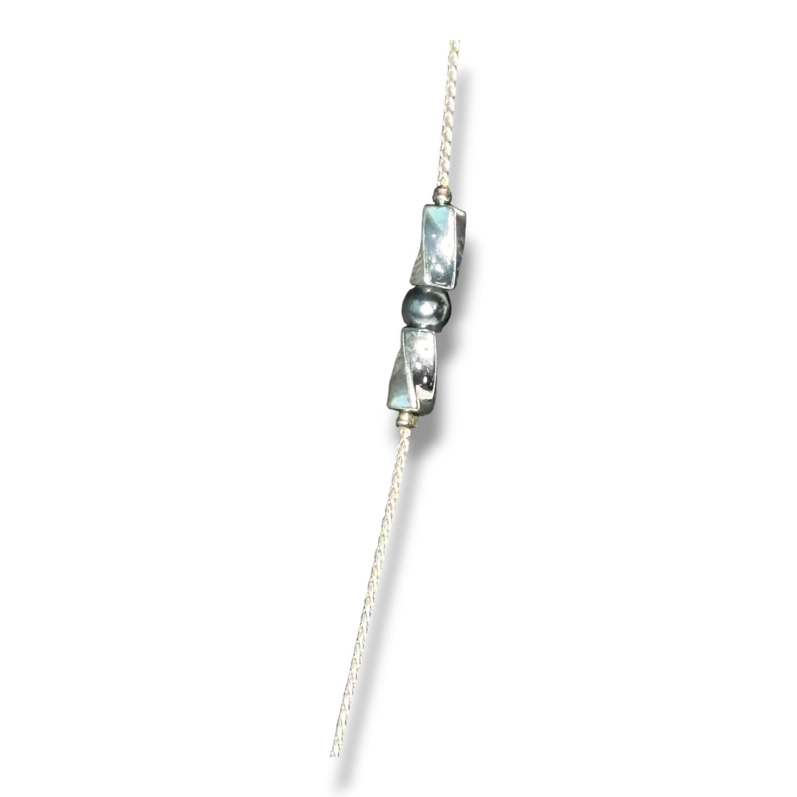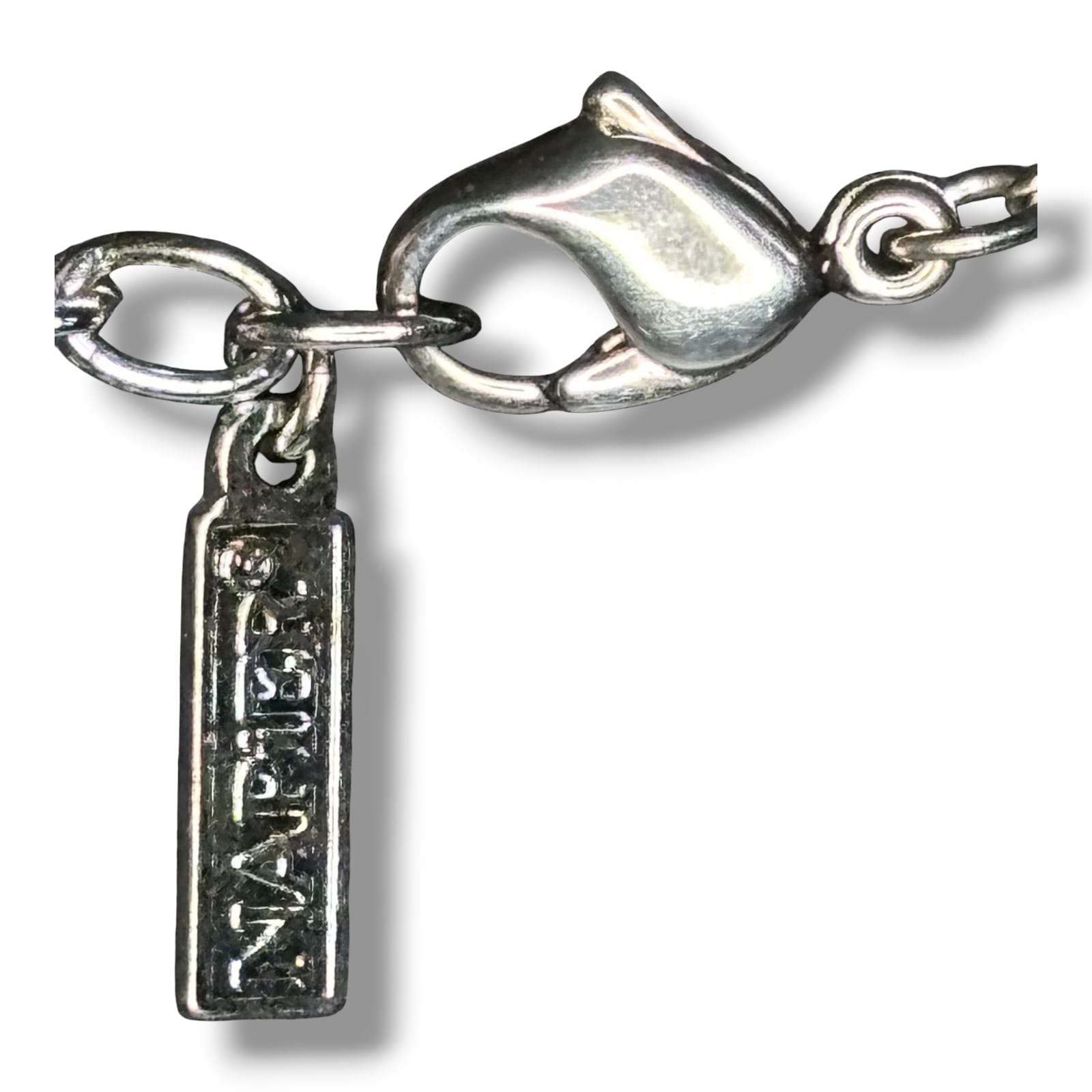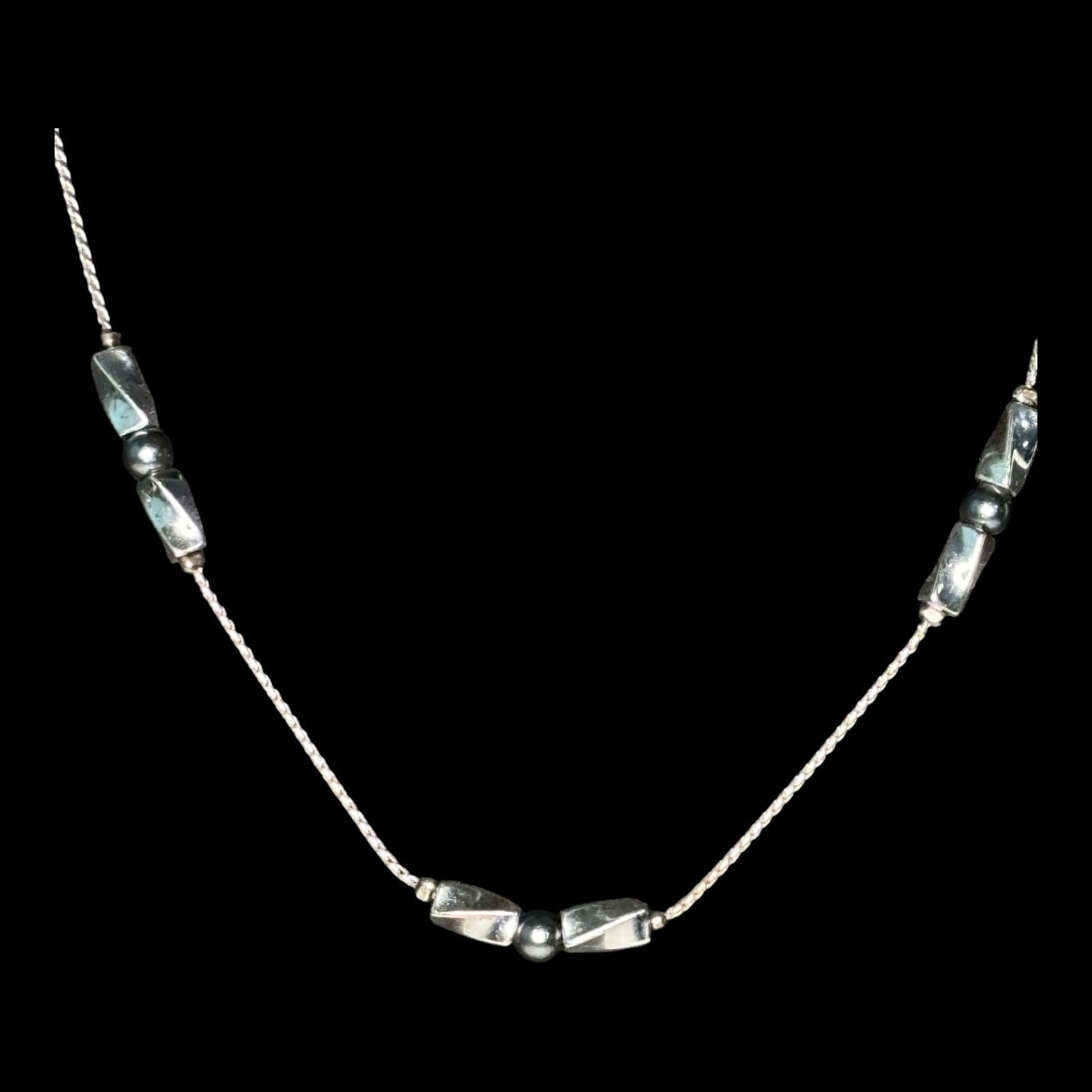 This Napier necklace dates to the 1990s and features a minimalist modernist design with geometric silver tone beads spaced along a fine chain. It measures 18 inches long and closes with a lobster clasp and signed Napier hang tag, reflecting the brand’s later production style. A versatile and understated piece that fits both vintage collections and contemporary wear.
