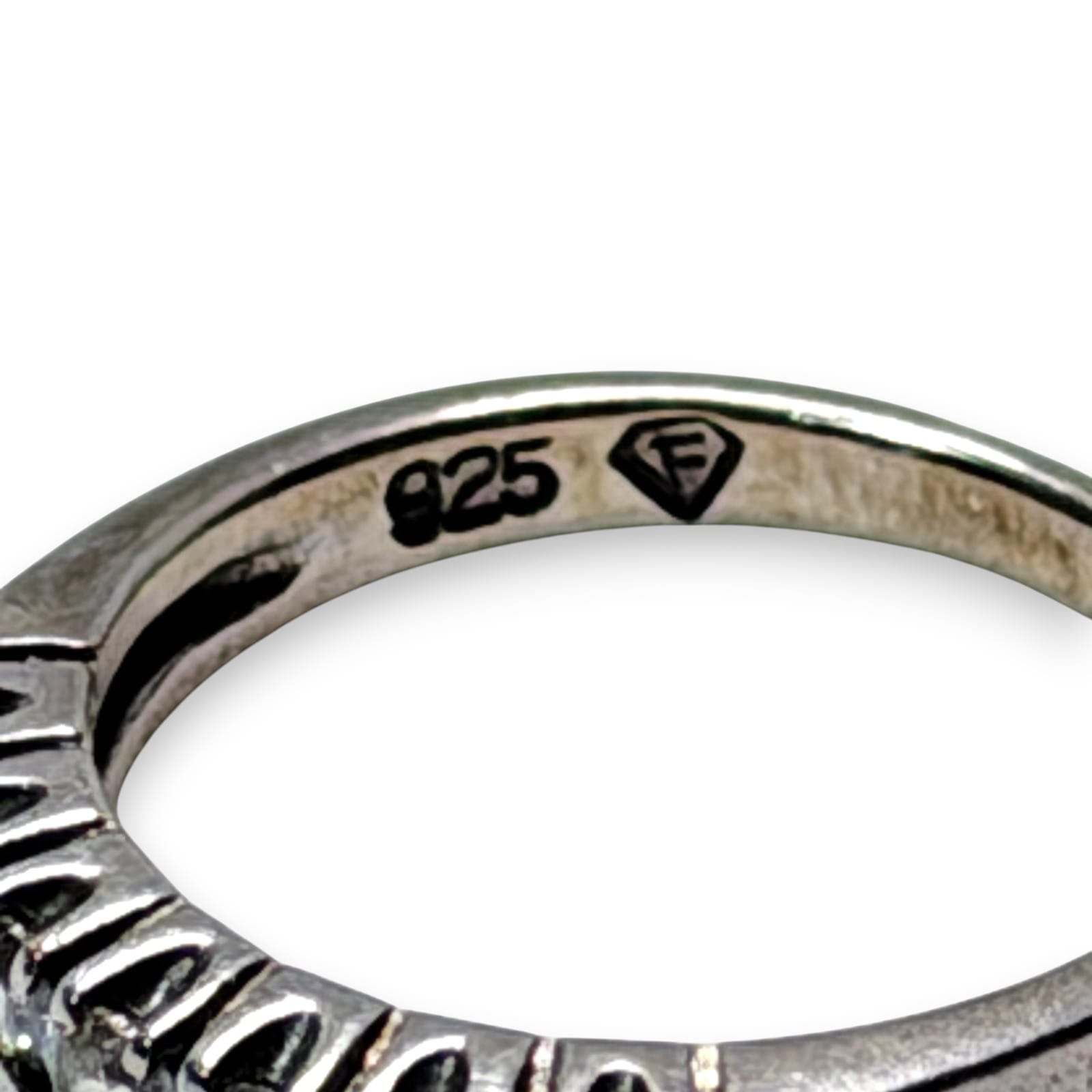 This vintage 1990s sterling silver ring is a small-size fashion piece set with glass rhinestones and marked 925 with an F in a diamond-shaped cartouche. It fits the market for wearable vintage sterling jewelry with modest precious-metal value and stronger appeal as an affordable dress ring.