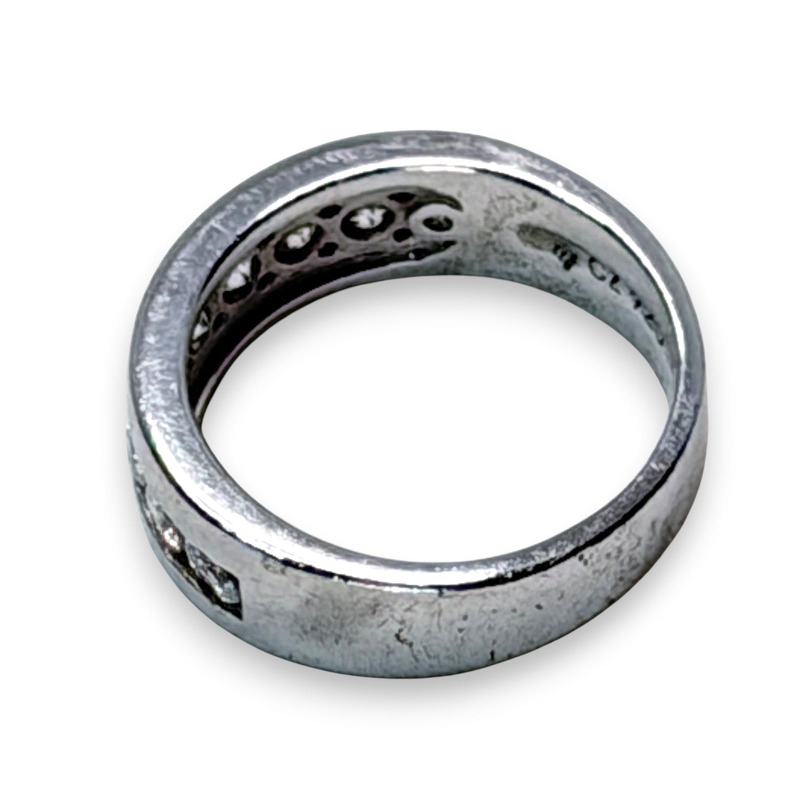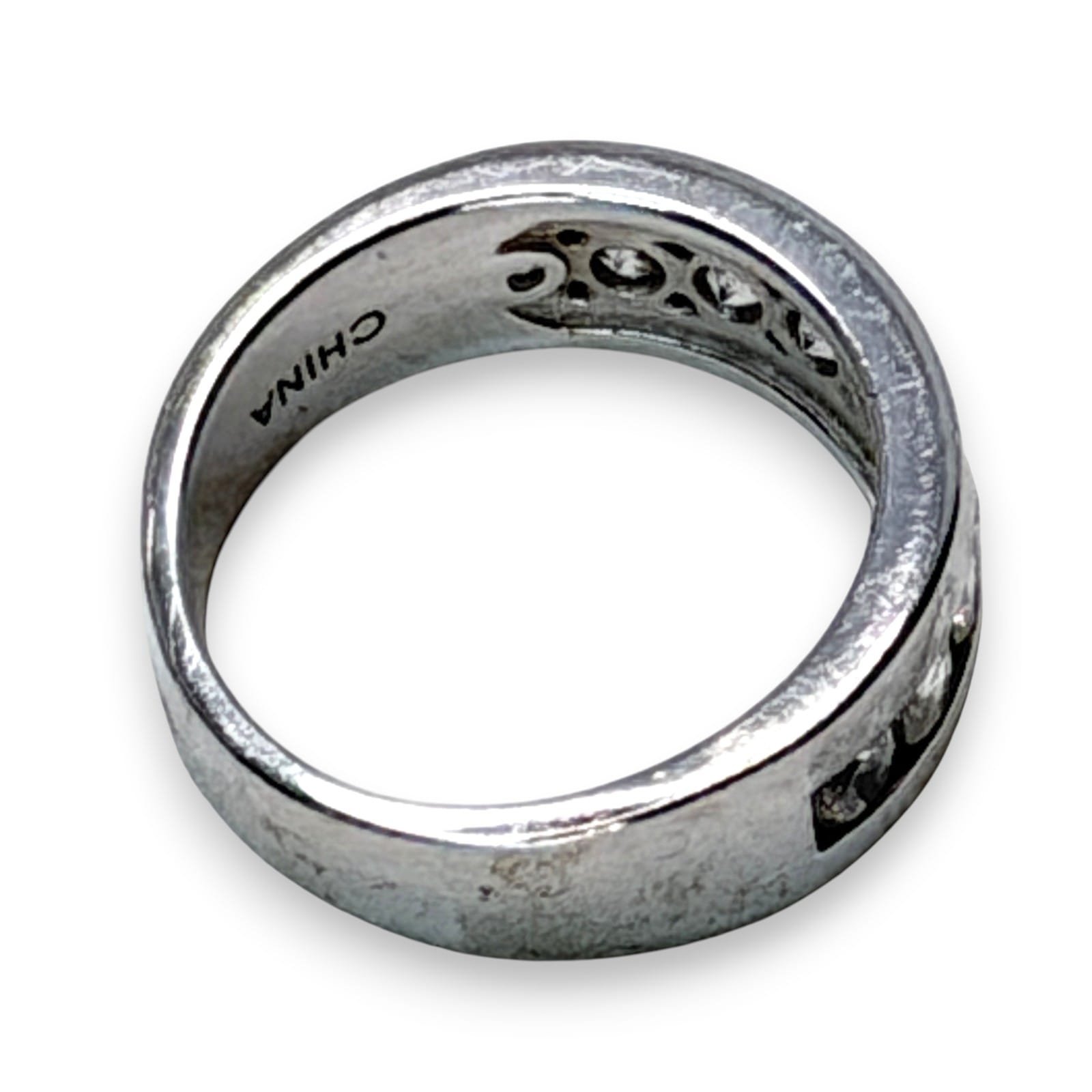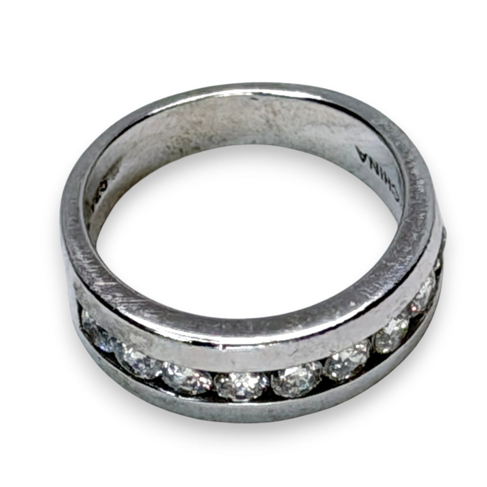 c.2000 sterling silver band ring with a channel-set row of colorless CZ stones in a clean modern design. The ring is marked 925, CZ, and China, and it fits within the common late-1990s to 2000s market for unbranded sterling fashion jewelry with anniversary band styling.