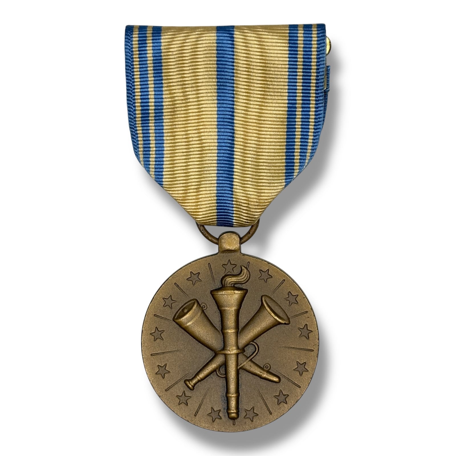This lot is a complete c.1950s United States Armed Forces Reserve Medal produced by Daniel Smilo & Sons, Inc. of New York. The medal was authorized by Executive Order 10163 on September 25, 1950, and awarded to members of the U.S. Armed Forces Reserve who completed ten years of honorable service. The bronze medal features three crossed bugles with a torch at center surrounded by stars, and the reverse bears the words “Armed Forces Reserve” with an eagle at center. It retains its original gold and blue ribbon and comes in the original blue Daniel Smilo & Sons presentation box with the correct stock label (No. 8380-NL) on the side.