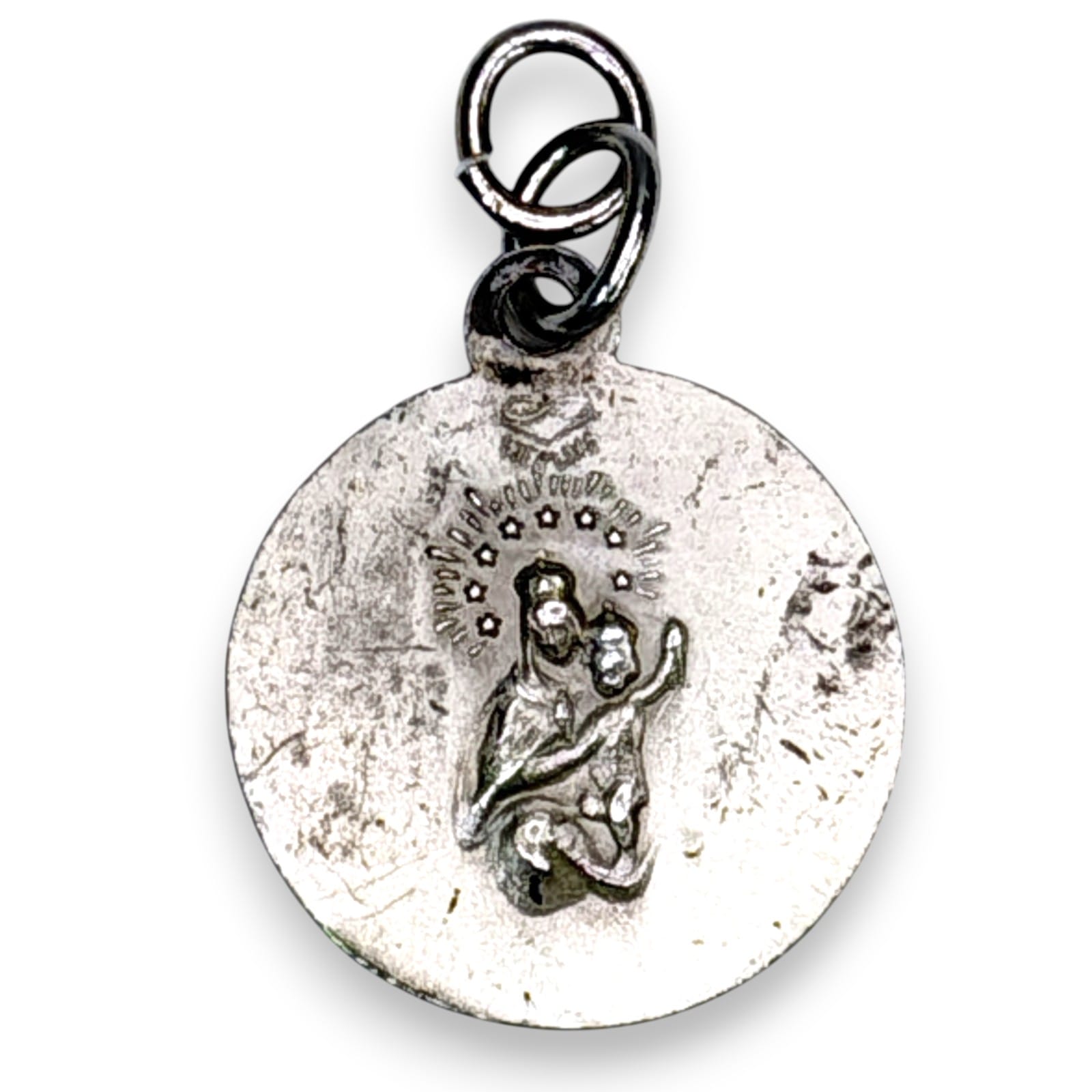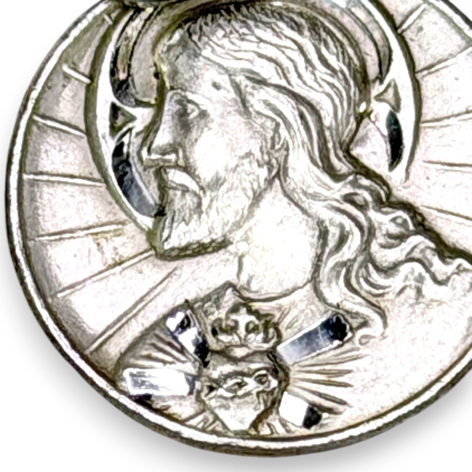 Vintage 1950s Catholic devotional medal in sterling silver featuring the Sacred Heart of Jesus on the front and a Marian image with the Christ Child on the reverse. This small two-sided medalet was made for wear as a pendant or charm and fits well within the mid-century tradition of personal religious jewelry and prayer medals.