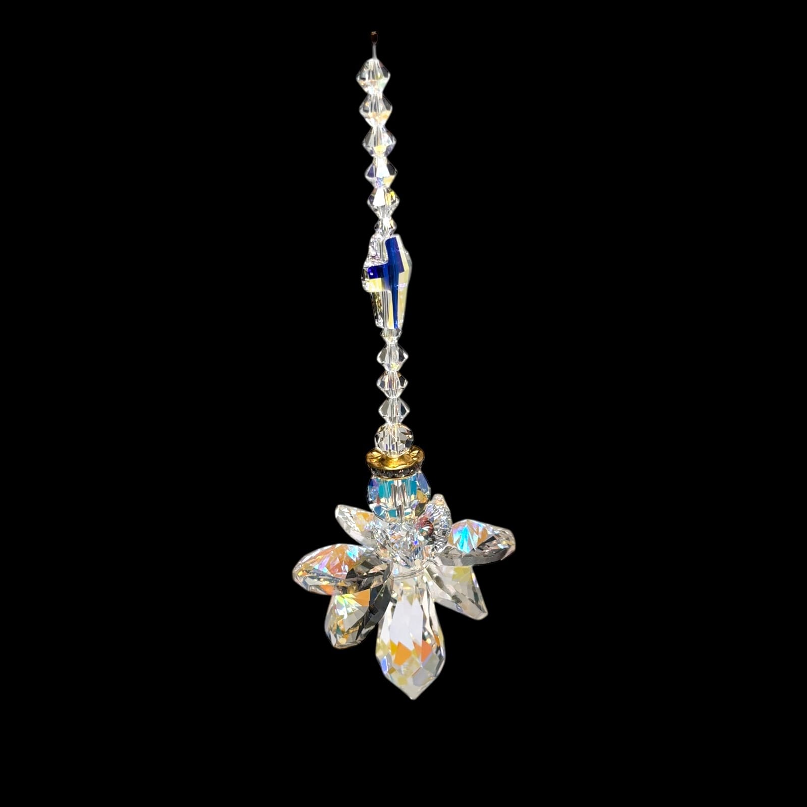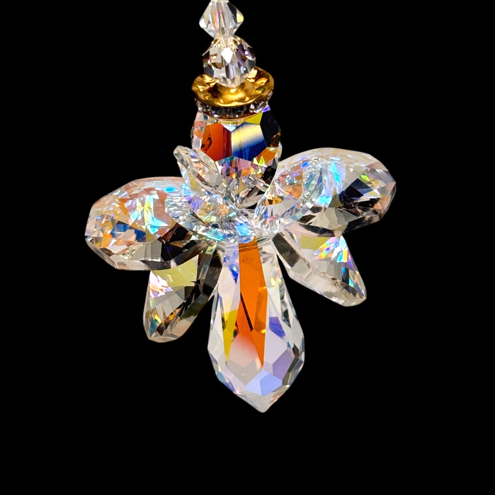 This listing is for a hand-blown glass ornament by Lilli Heart Designs featuring a suspended red heart within a clear teardrop-shaped body. The ornament measures approximately 7.5 inches tall by 2 inches wide and comes in its original presentation box. These contemporary artisan glass creations are popular symbolic gifts representing love, hope, and remembrance, and display beautifully in any setting.