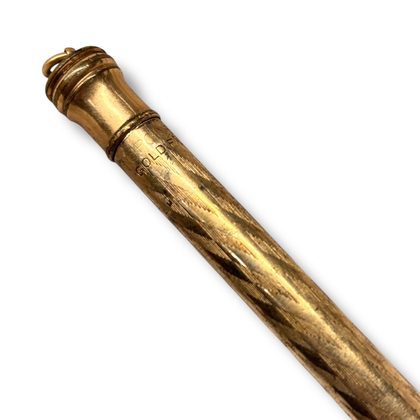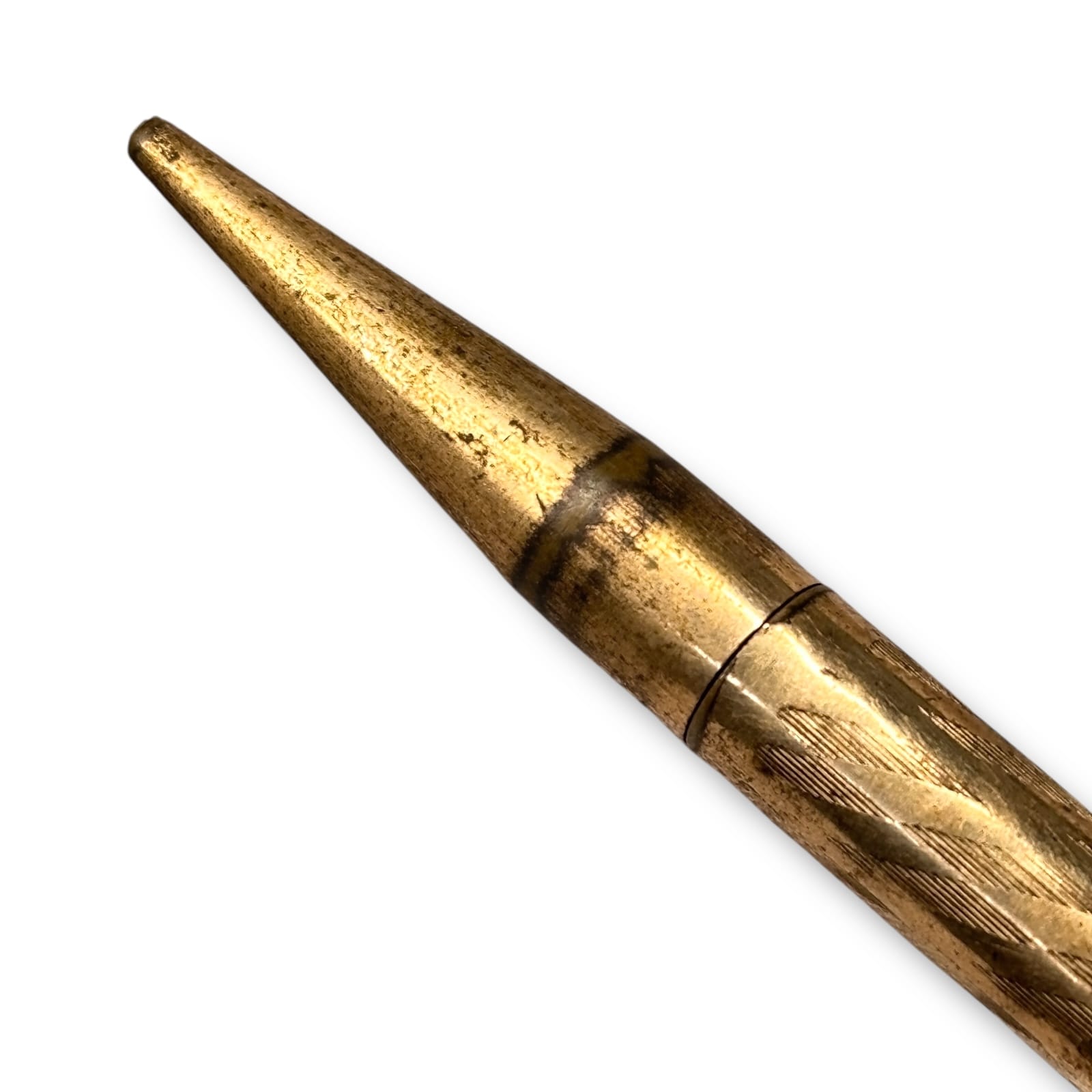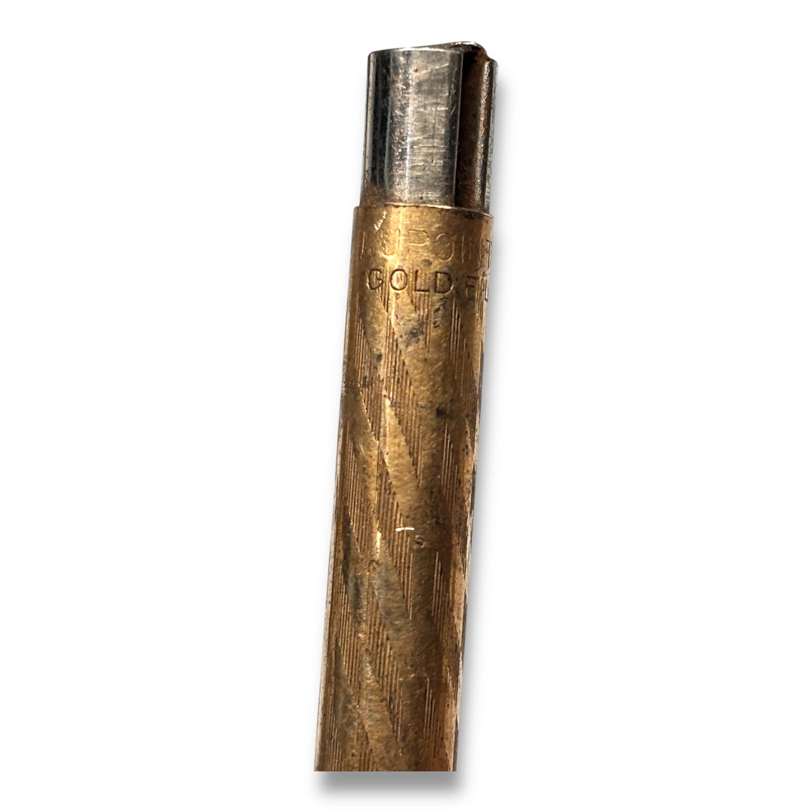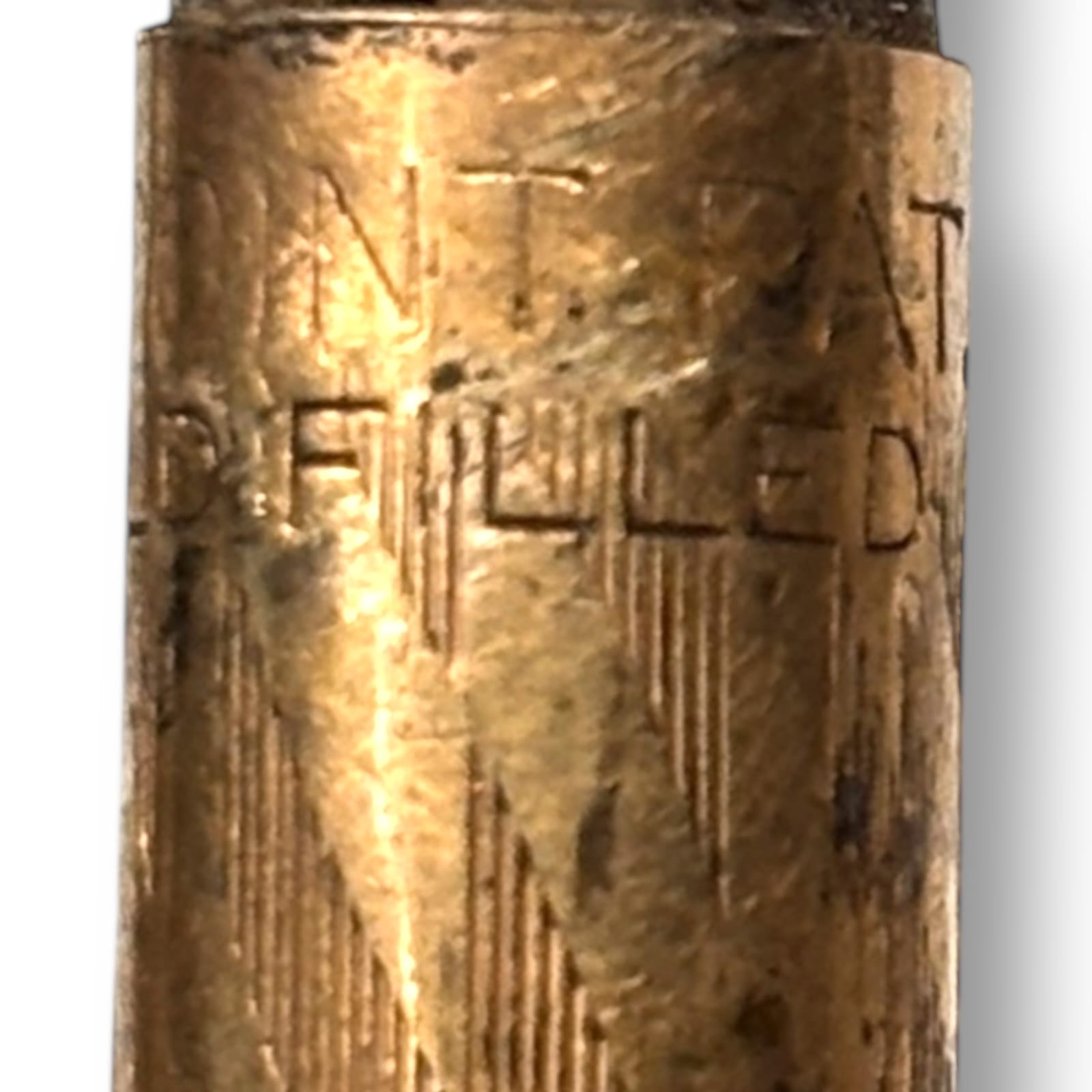 This original c.1920 Nu-Pointe mechanical pencil is crafted in gold-filled brass with a fine engraved linear pattern reflecting early Art Deco design. It measures approximately 3.75 inches long and features a twist-advance lead mechanism with a small suspension ring at the top for attachment to a chatelaine or watch chain. The pencil retains its āNU-POINTEā and āGOLD FILLEDā markings and shows moderate surface wear consistent with age, with the mechanism functioning smoothly.
