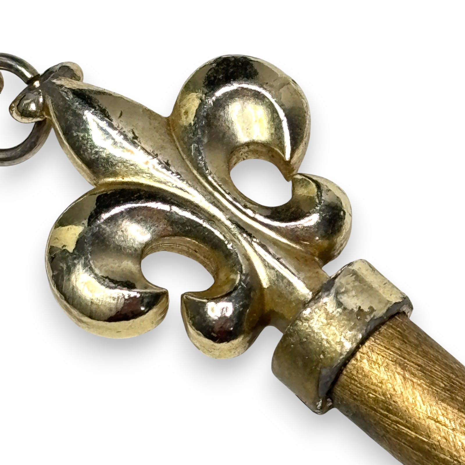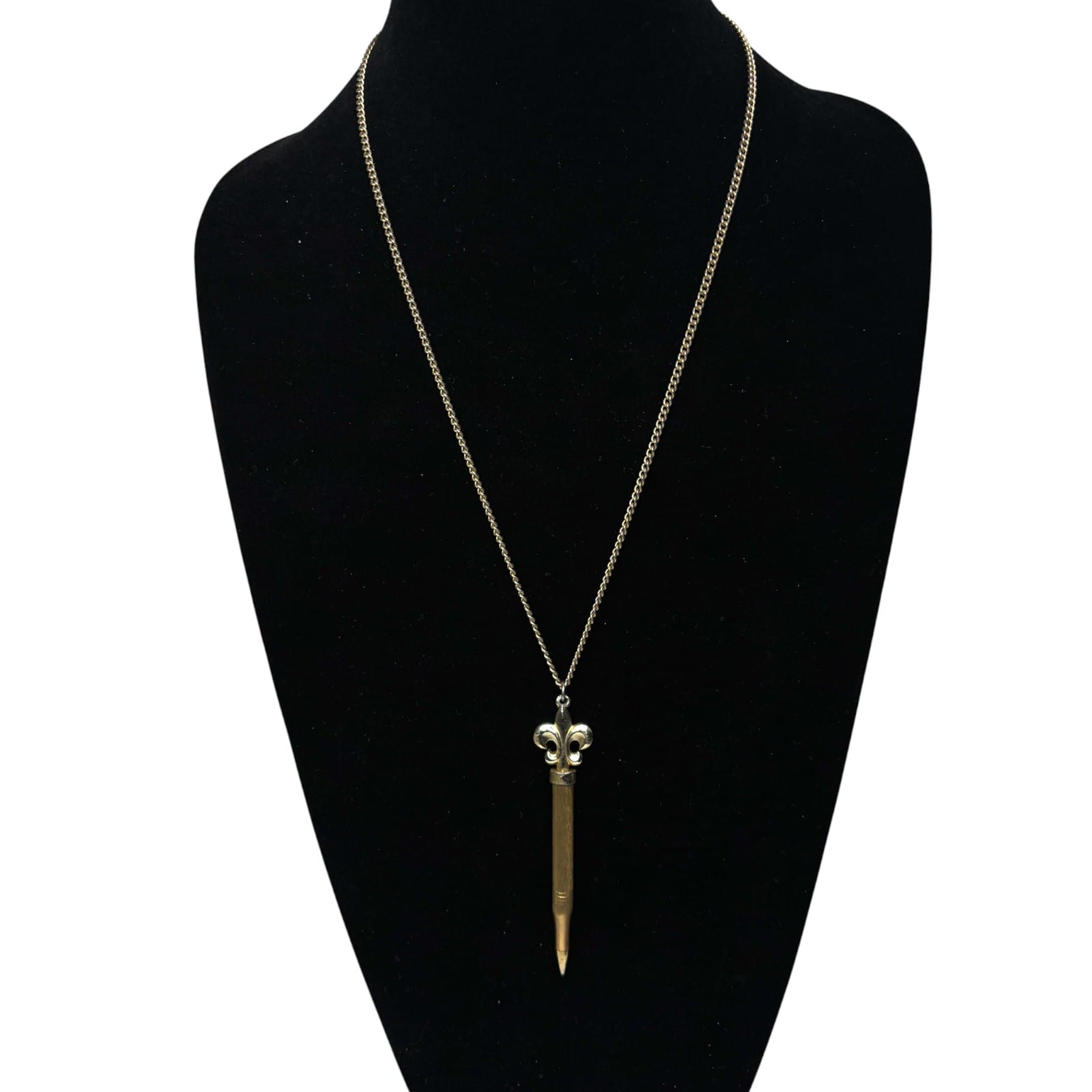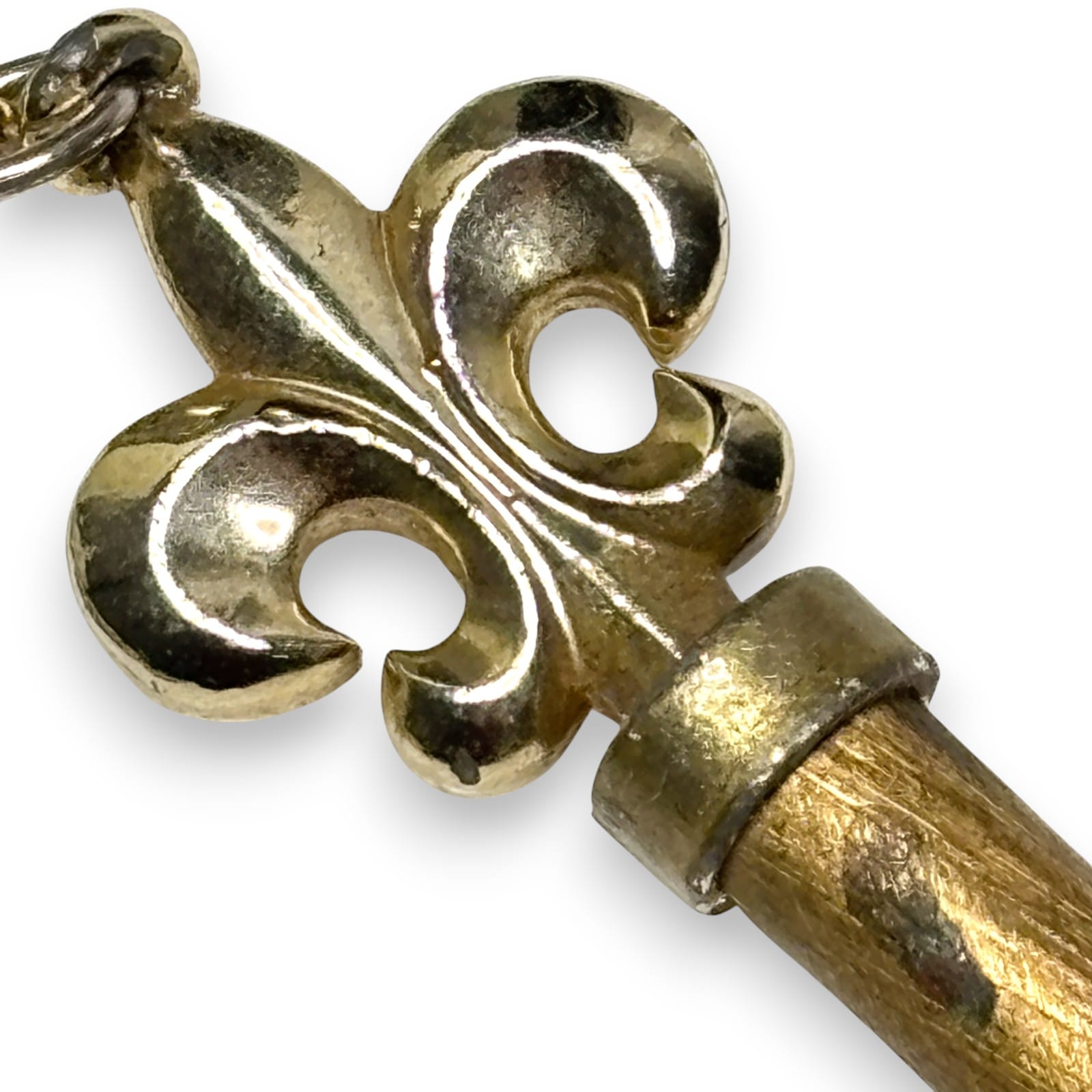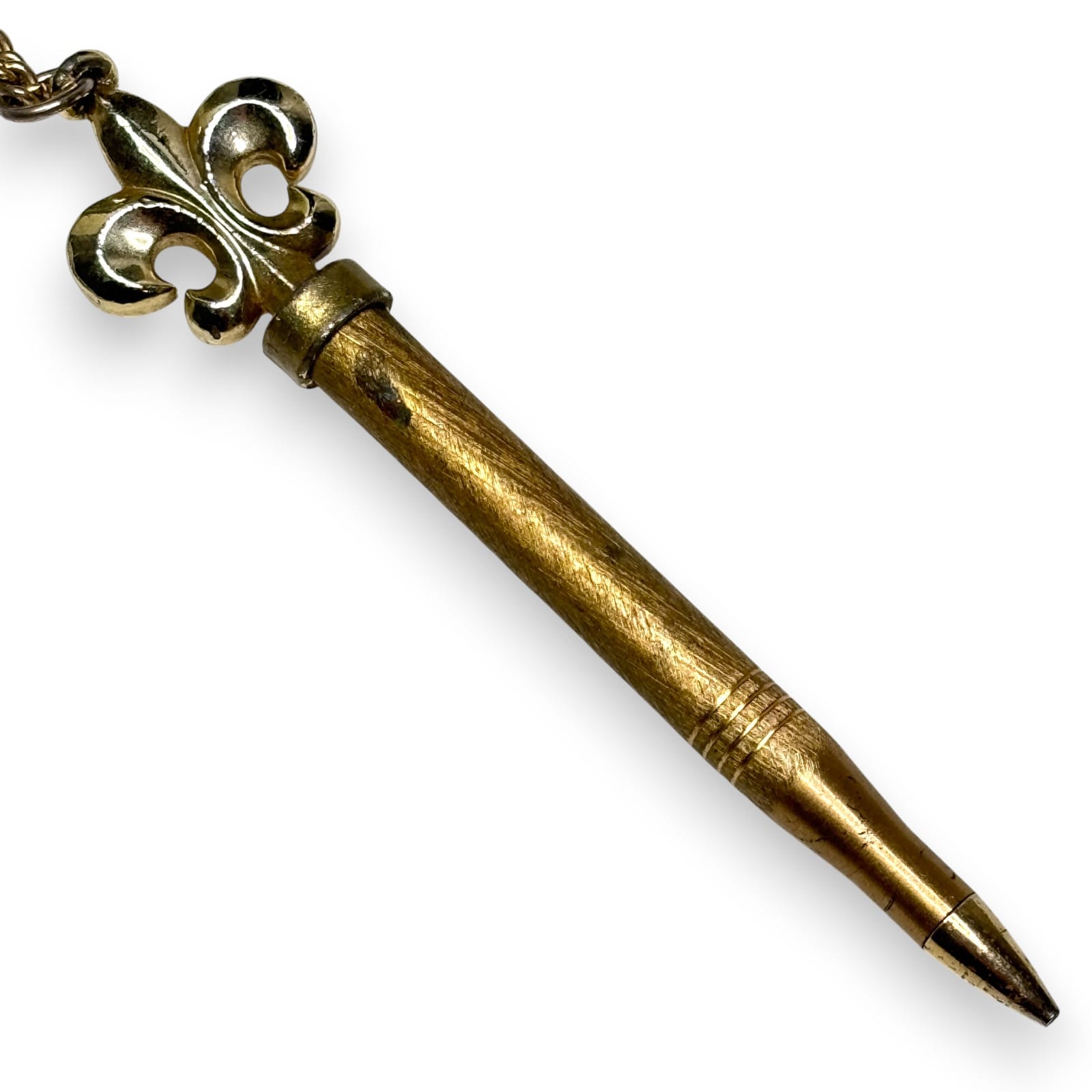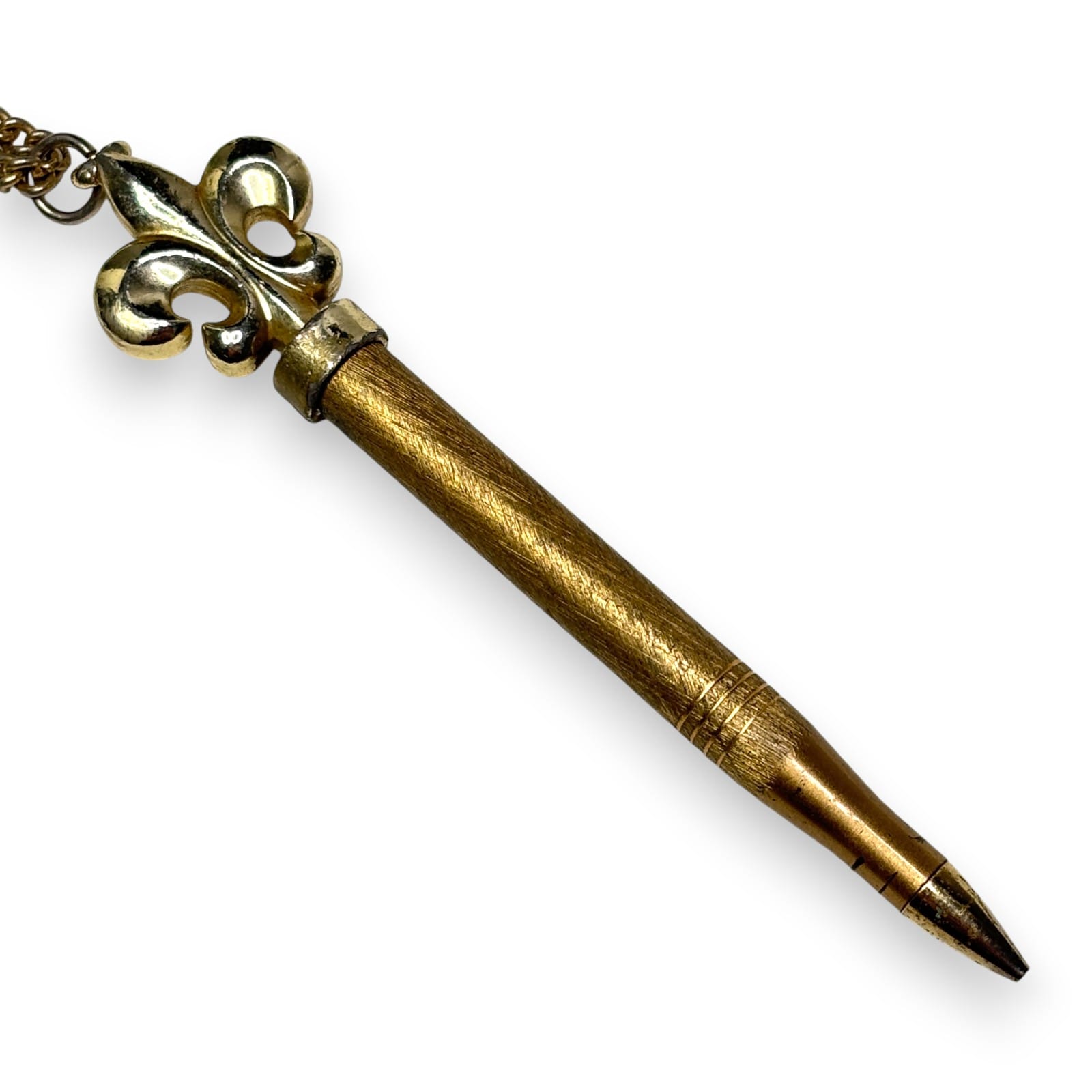 Mid-Century Gold Tone Fleur-de-Lis Mechanical Pencil Pendant Necklace 24in Chain