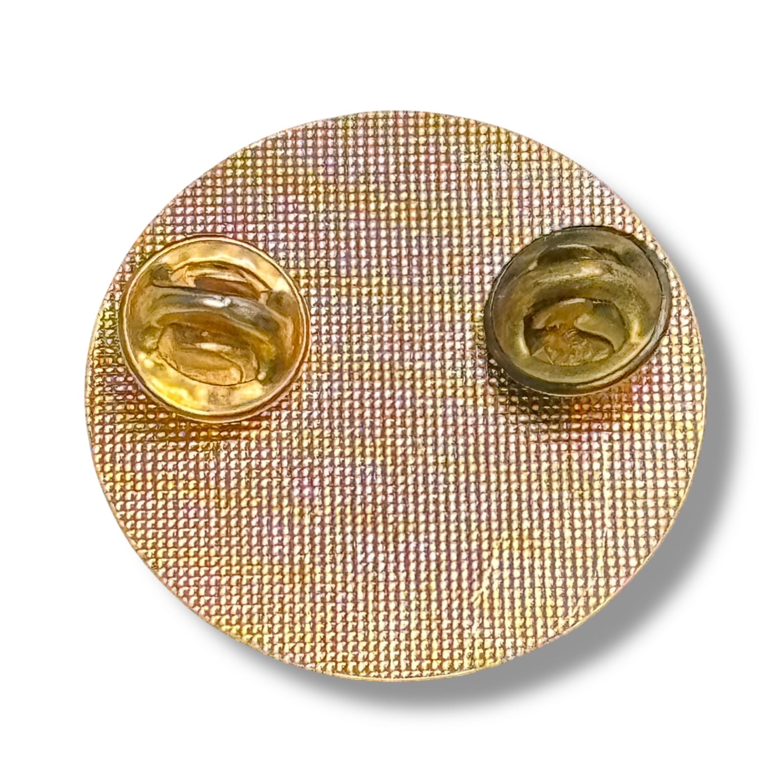 Round Lions Club lapel pin commemorating the 1997 Pensacola, Florida convention. The design features a blue enamel map of Florida with gold trim, the Lions International emblem, and a sailing ship symbolizing Pensacolaās maritime heritage. The front has a glossy celluloid finish and gold-tone lettering, while the reverse is textured gold-tone metal with two clutch fasteners. Diameter approximately 1.5 inches.