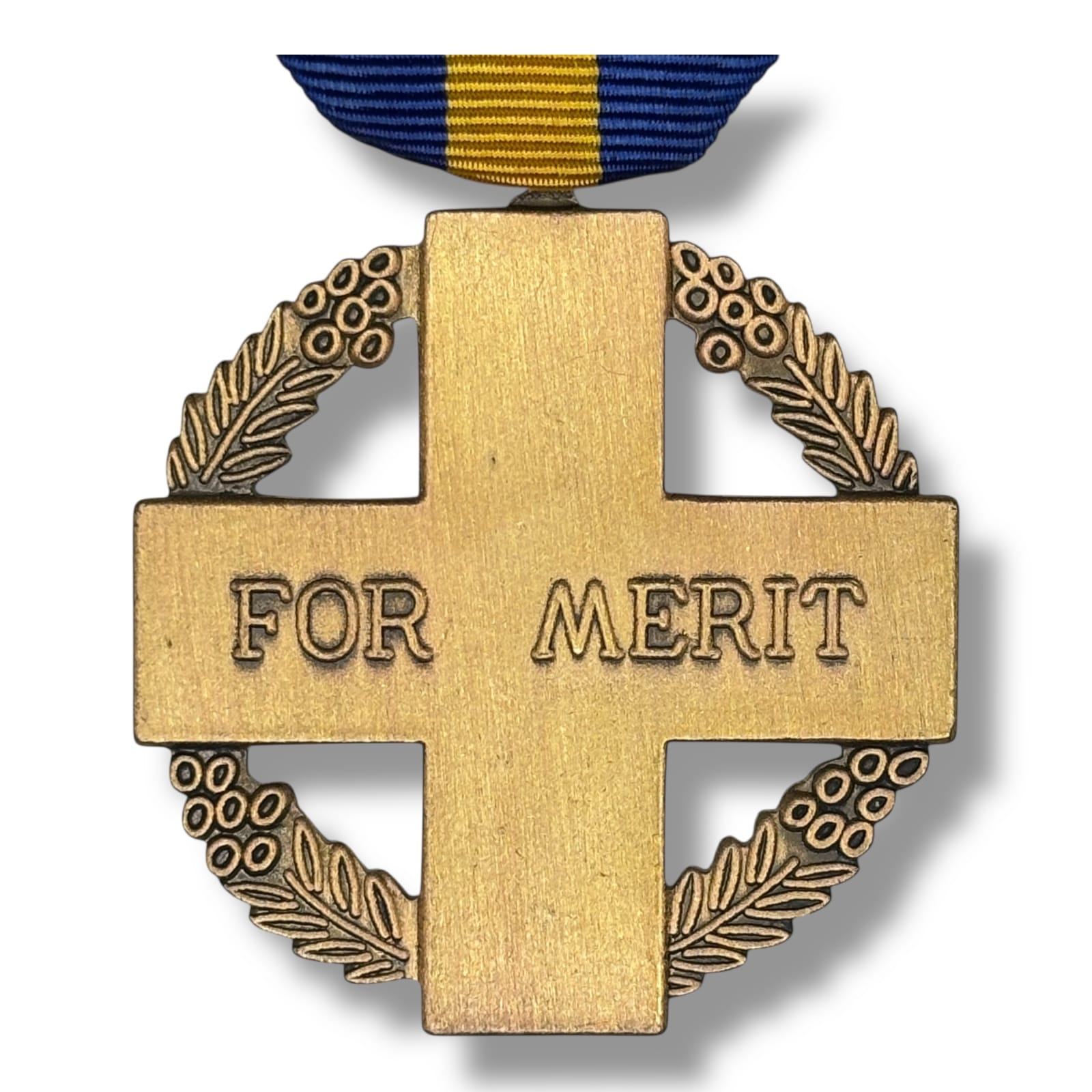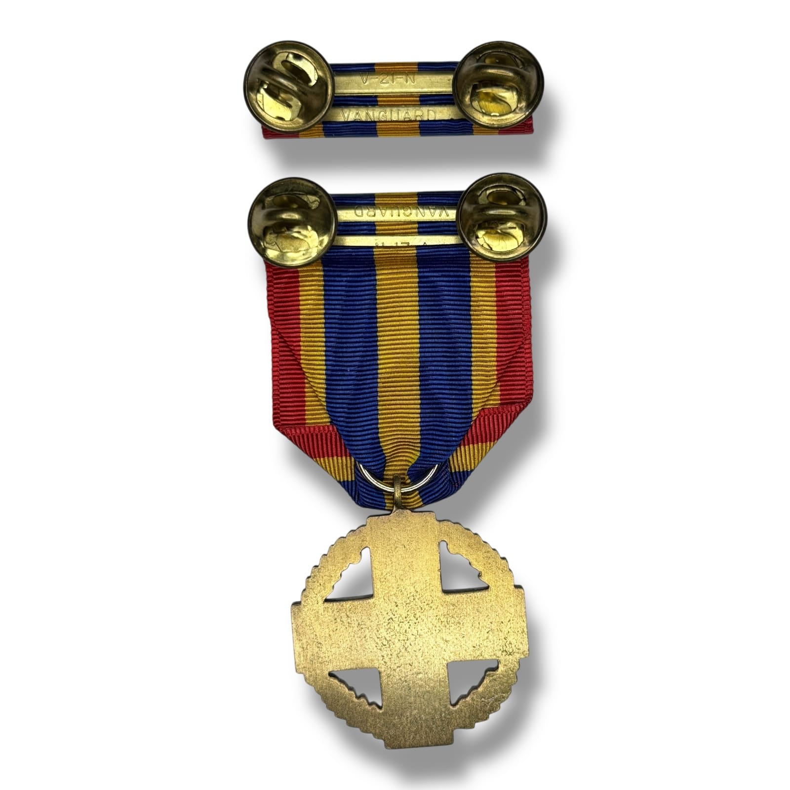 This c.1950s Vanguard “For Merit” medal and ribbon bar set was produced in Attleboro, Massachusetts by Vanguard Industries, a longtime maker of U.S. military and fraternal insignia. The gilt bronze cross features a laurel wreath surrounding the words “FOR MERIT” and is suspended from a ribbon of red, blue, and yellow stripes with a matching pin-back ribbon bar. The reverse of both pieces is stamped “VANGUARD.” This complete matching set is clean and well preserved.