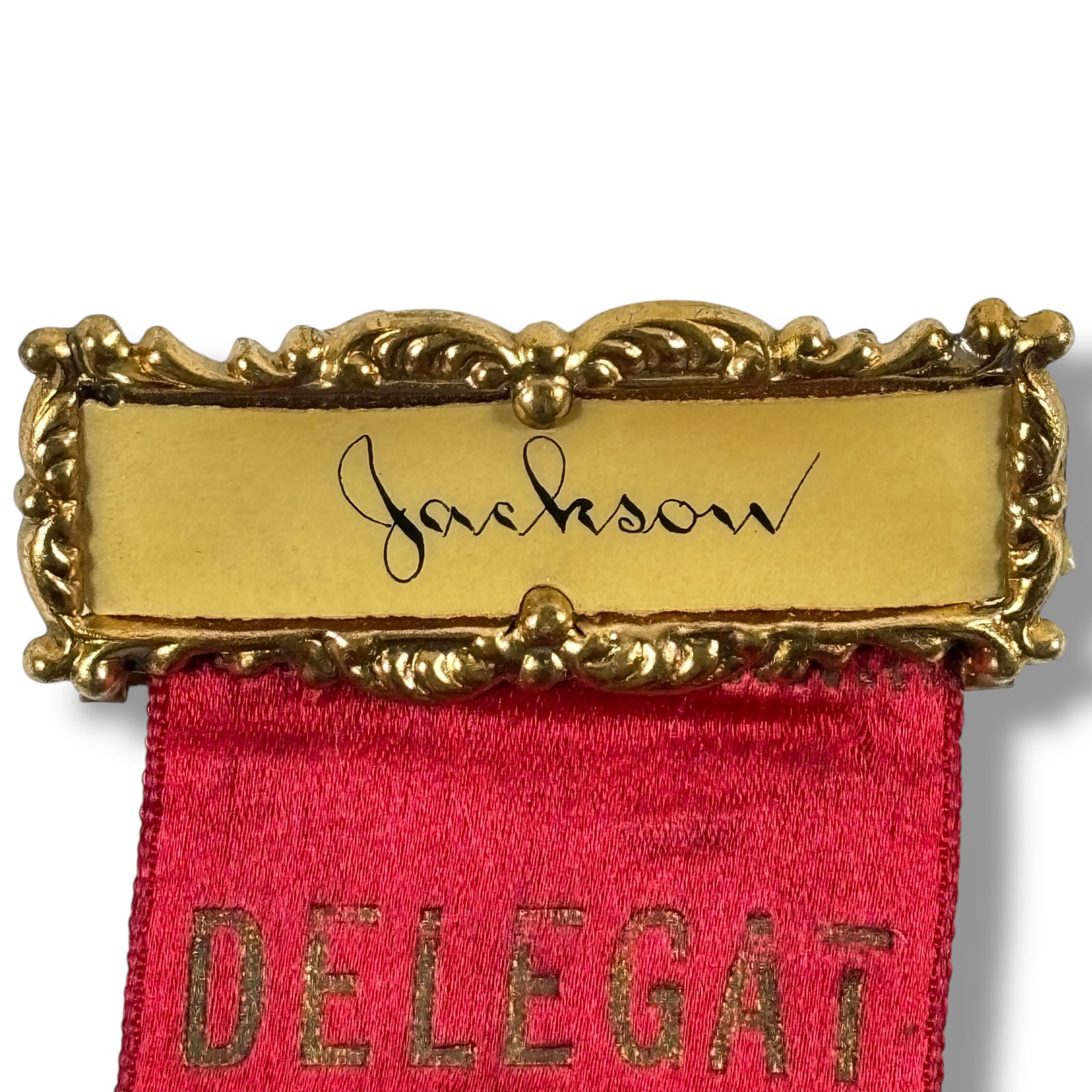The badge is divided into two parts. The top part is a metal name holder, in this case, with the name “Jackson”. The bottom part of the badge has a silk ribbon promoting the convention along with its date and location. Attached to the ribbon is a medal bearing the name of the association. The medal is covered with celluloid and set in a bezeled metal frame. The badge is approximately 5.75″ tall by 2″ wide.