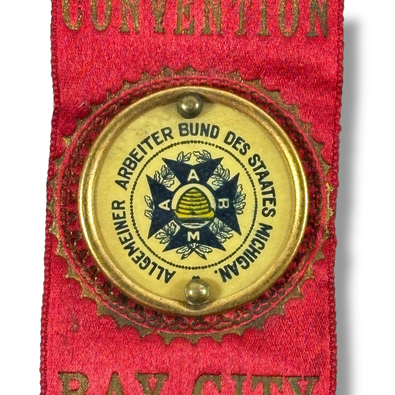 This lot is a scarce antique badge for the 38th convention of the Allgemeiner Arbeiter Bund Des Staates Michigan or the General Workers’ Union of the State of Michigan held in Bay City, Michigan on June 13-15, 1905. The General Workers’ Union was a German-American labor union, established to represent the interests of German-speaking immigrants and workers. These types of unions often focused on issues such as better wages, working conditions, and political representation for German immigrants.This organization was part of the broader network of immigrant worker associations that existed in the U.S. in the late 19th and early 20th centuries, particularly in communities with large German-American populations.