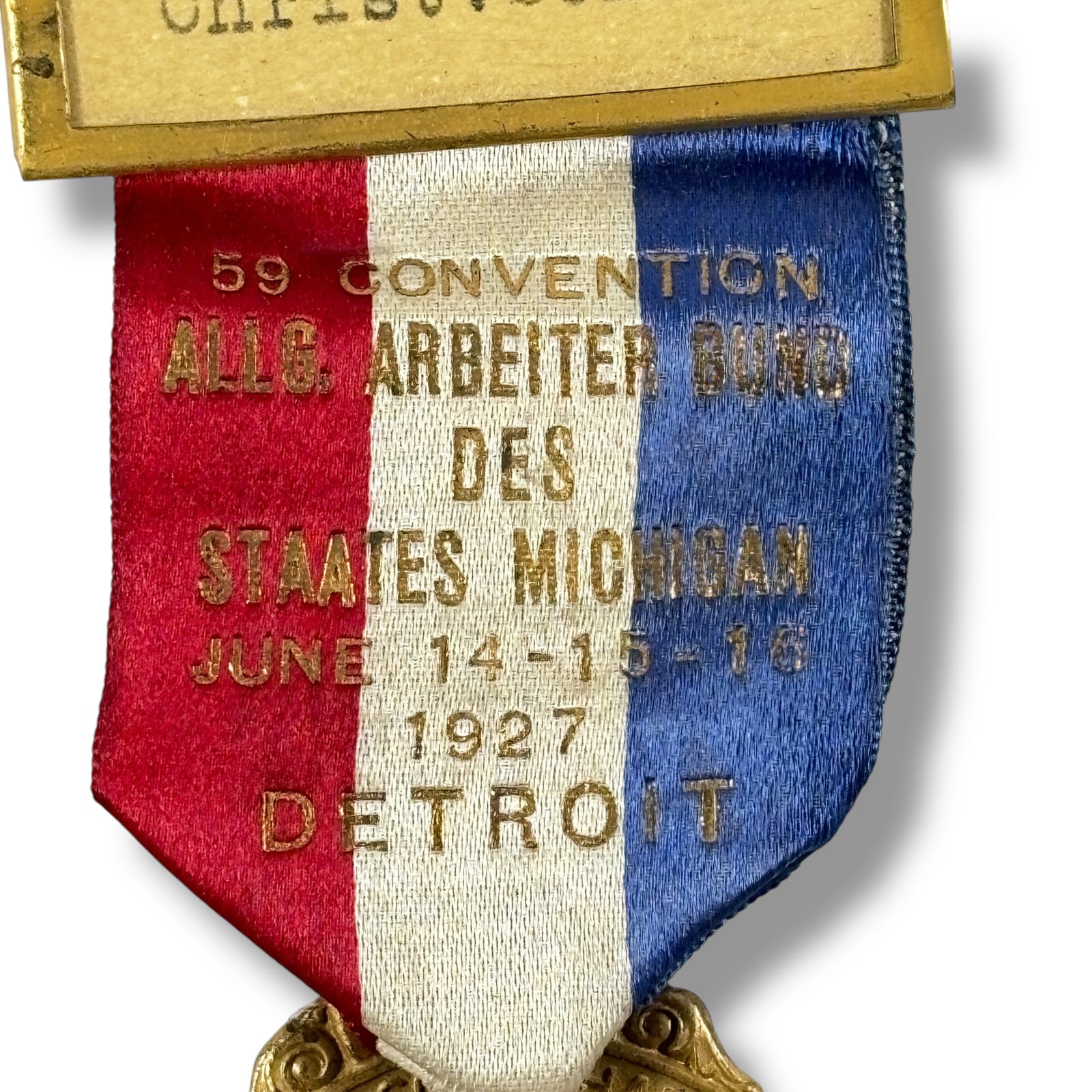 This lot is a scarce antique badge for the 59th convention of the Allgemeiner Arbeiter Bund Des Staates Michigan or the General Workers’ Union of the State of Michigan held in Detroit, Michigan on June 14-16, 1927. The General Workers’ Union was a German-American labor union, established to represent the interests of German-speaking immigrants and workers. These types of unions often focused on issues such as better wages, working conditions, and political representation for German immigrants.This organization was part of the broader network of immigrant worker associations that existed in the U.S. in the late 19th and early 20th centuries, particularly in communities with large German-American populations.