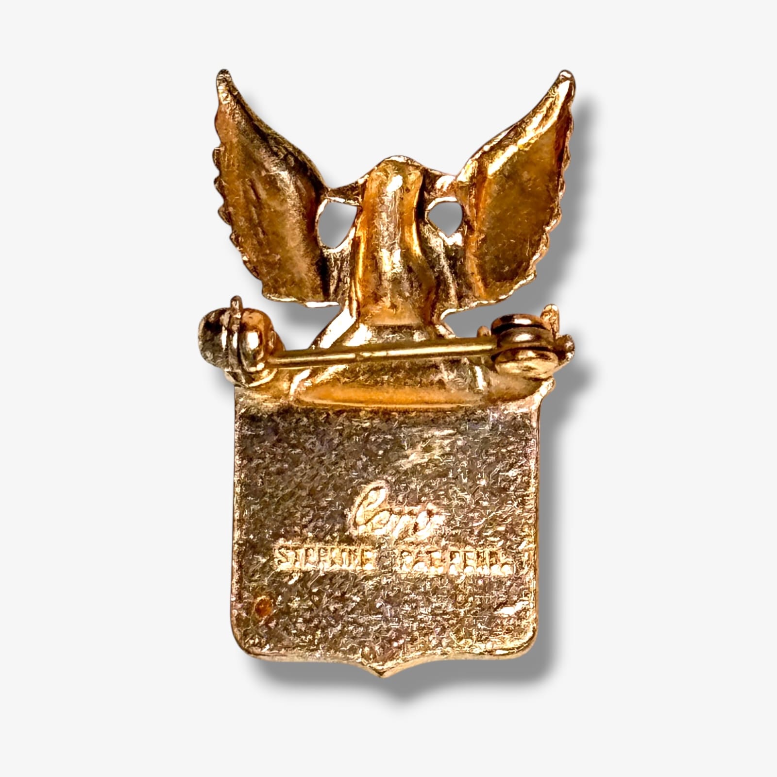 This original 1940s World War II “Son in Service” pin was made by Coro in sterling silver with gold finish and red, white, and blue enamel. It features a spread-wing eagle above a shield reading “US Son in Service.” Pins like this were worn by parents to honor a family member serving in the armed forces during the war. The back is stamped Coro Sterling Pat. Pend., confirming an authentic wartime issue.