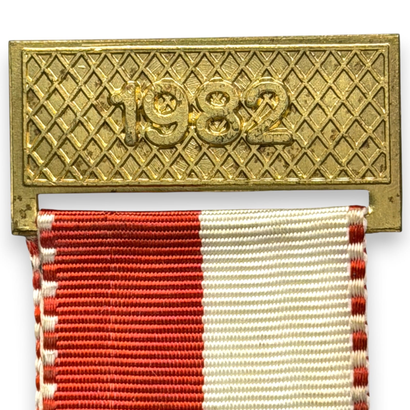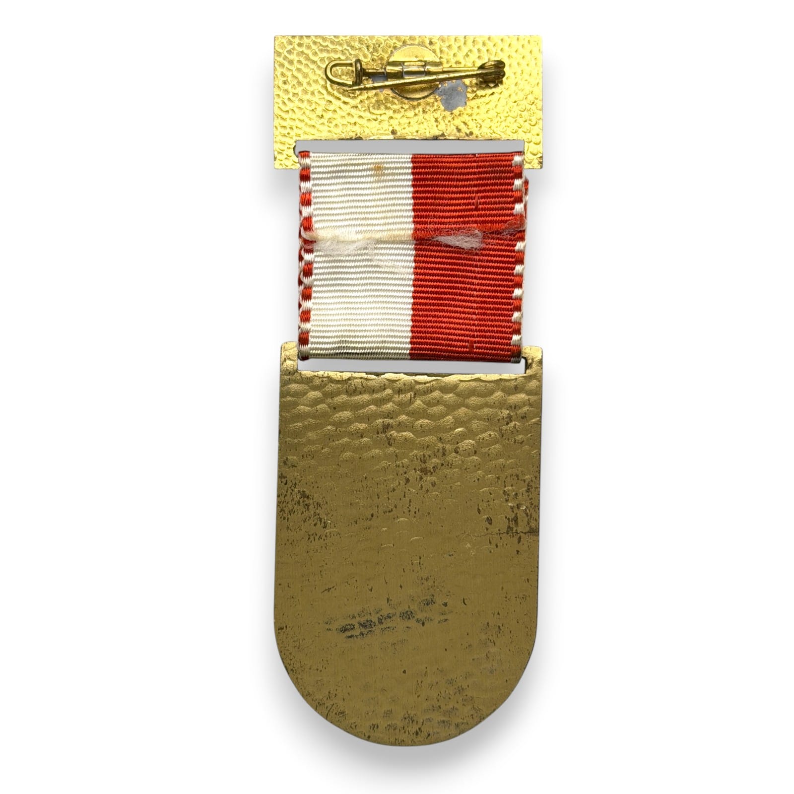 German fire brigade competition award badge dated 1982 from Kreisfeuerwehrverband Bergstrasse. Gilt brass drop with district text and heraldic shield. Red and white ribbon with matching 1982 year bar.